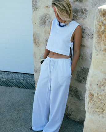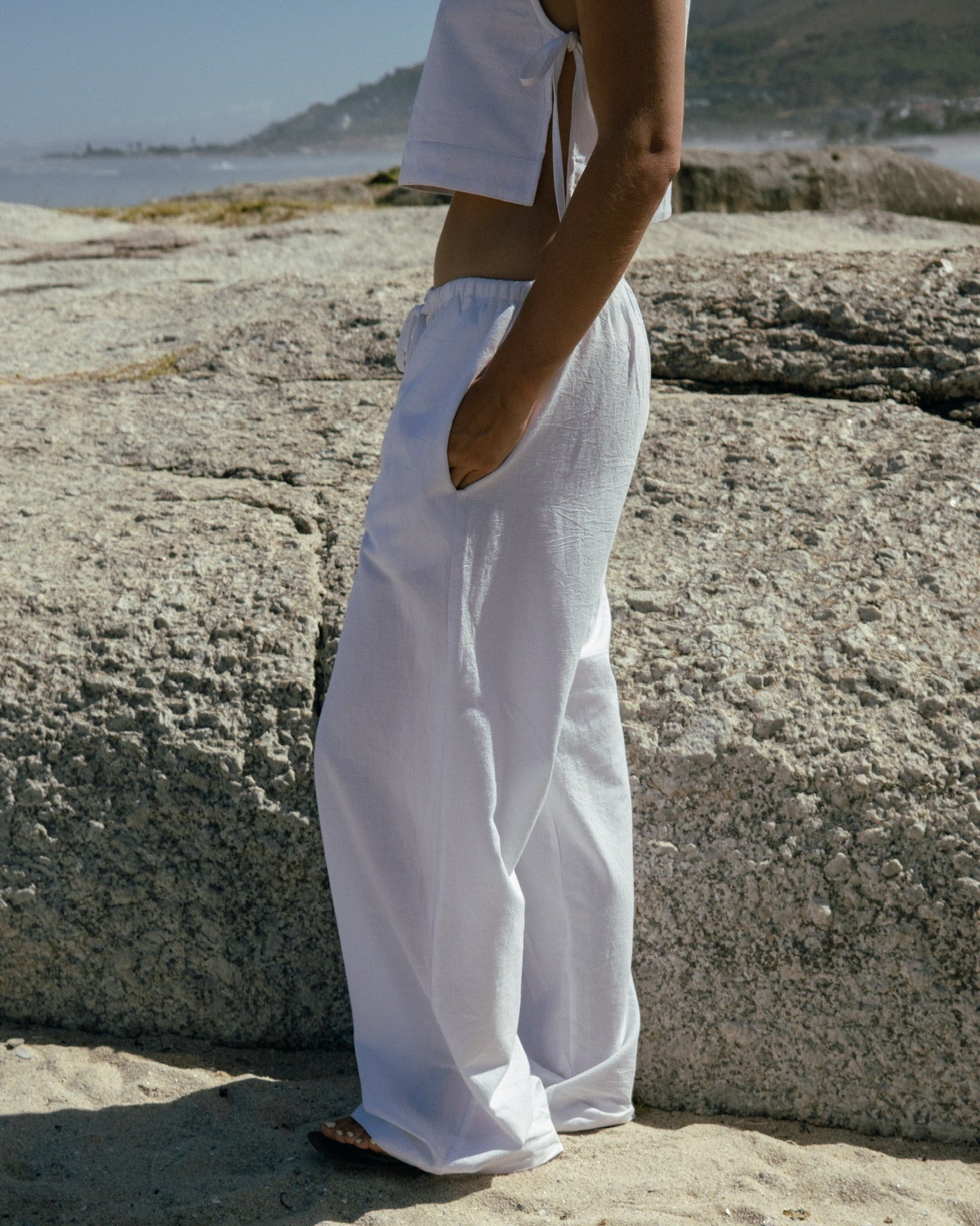 Pantalones Luna. Estos pantalones ofrecen un corte holgado y cómodo con un cordón blanco en la cintura para ajustarlos a tu gusto. Combínalos con nuestra blusa POP o el top Luna para un conjunto perfecto. Fabricado en 100% algodón y disponible en 3 tamaños.