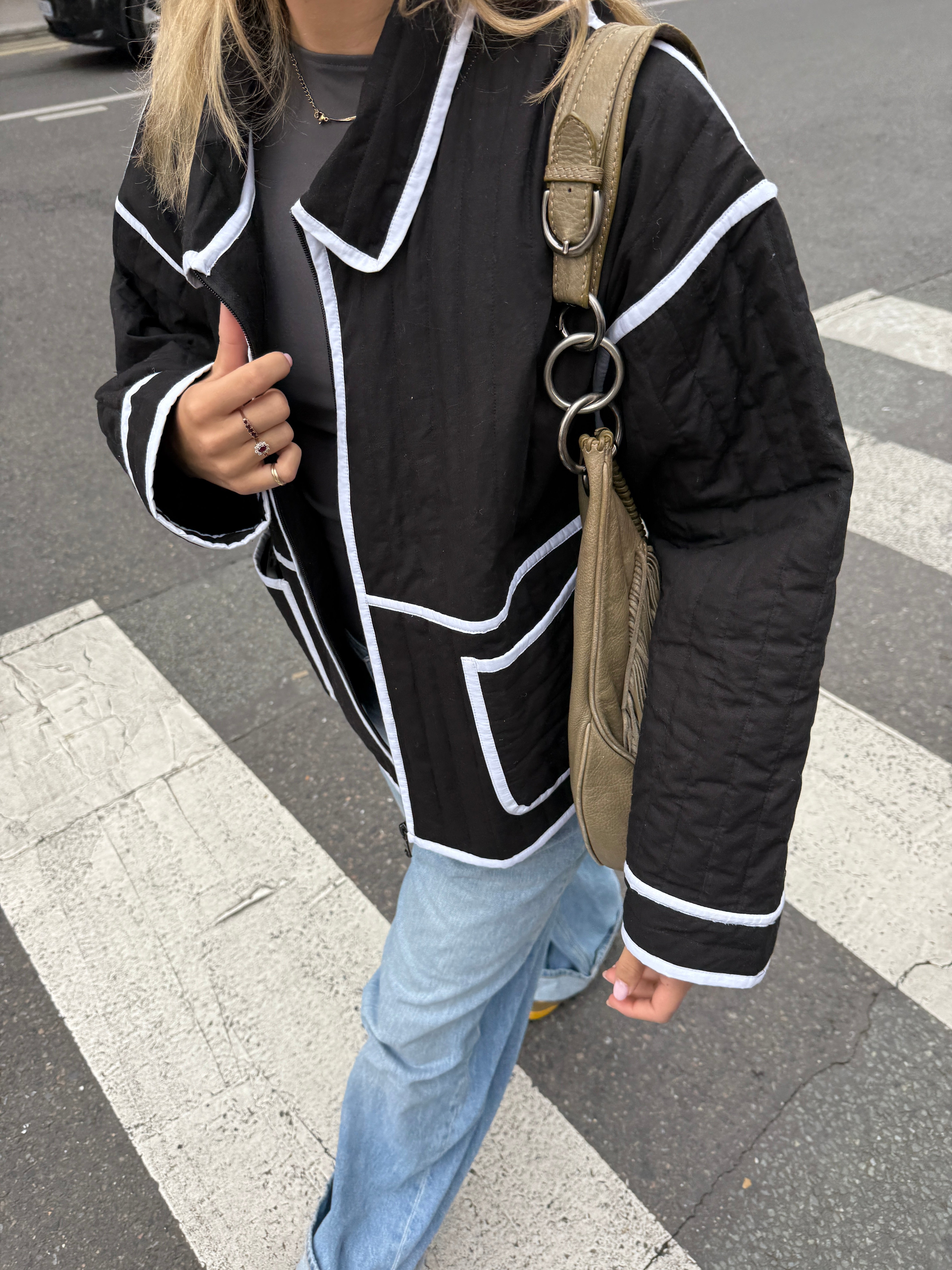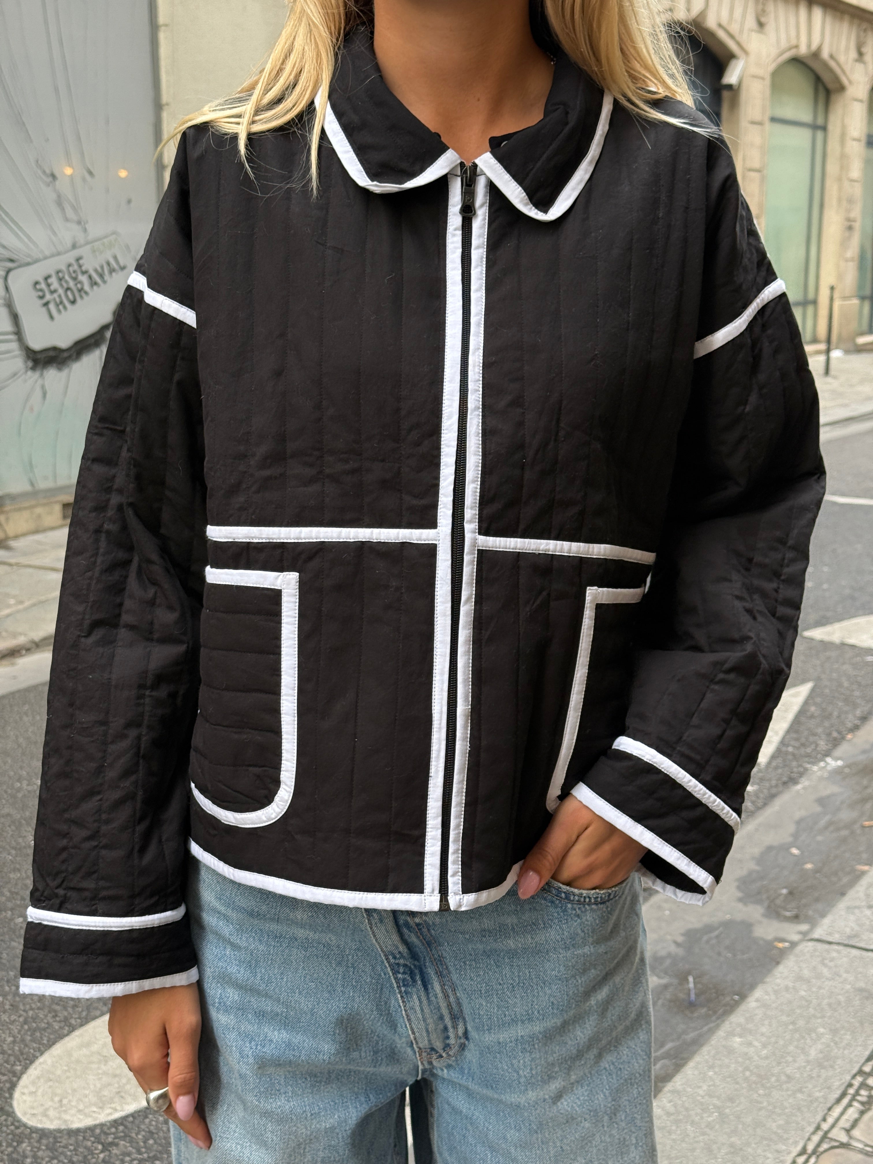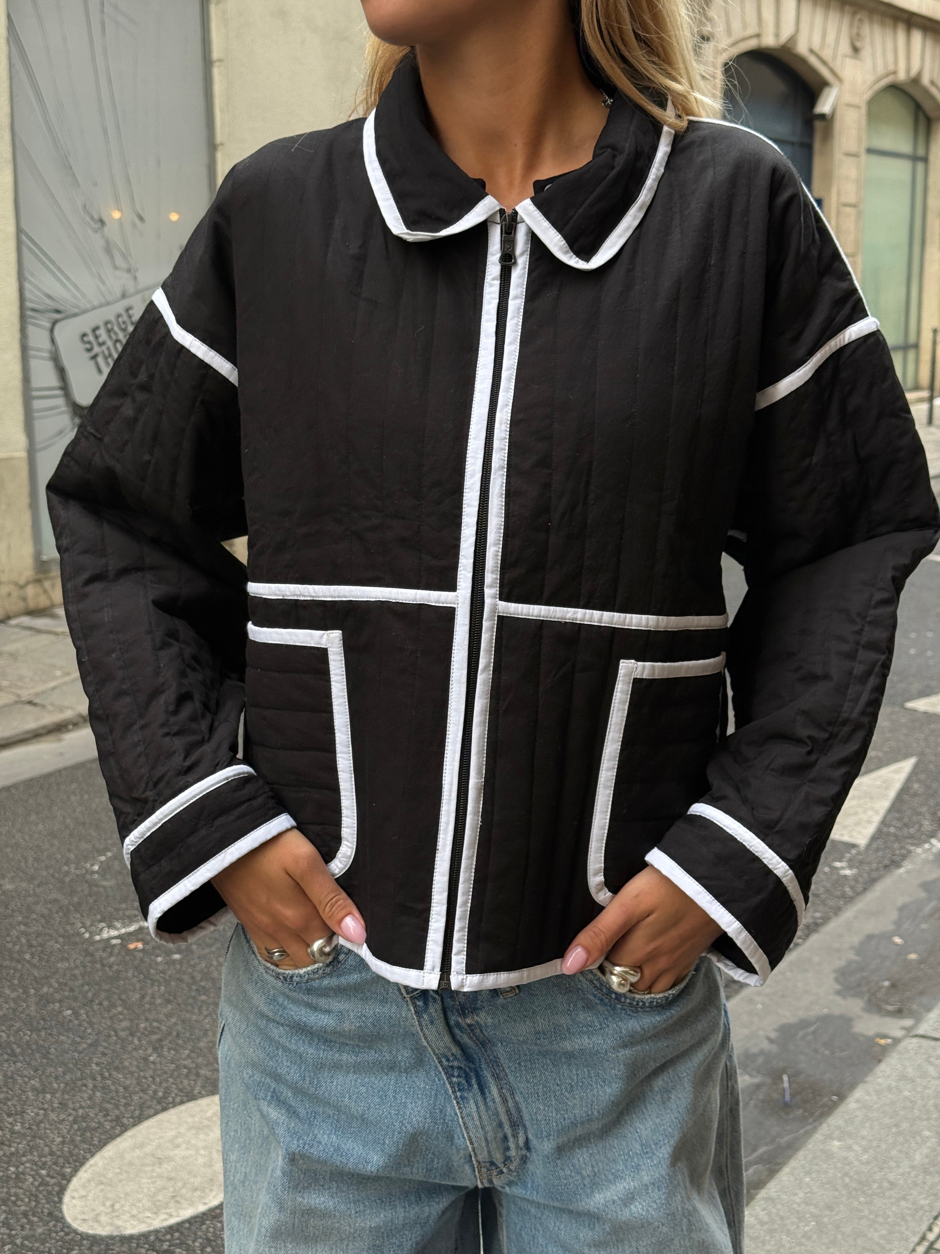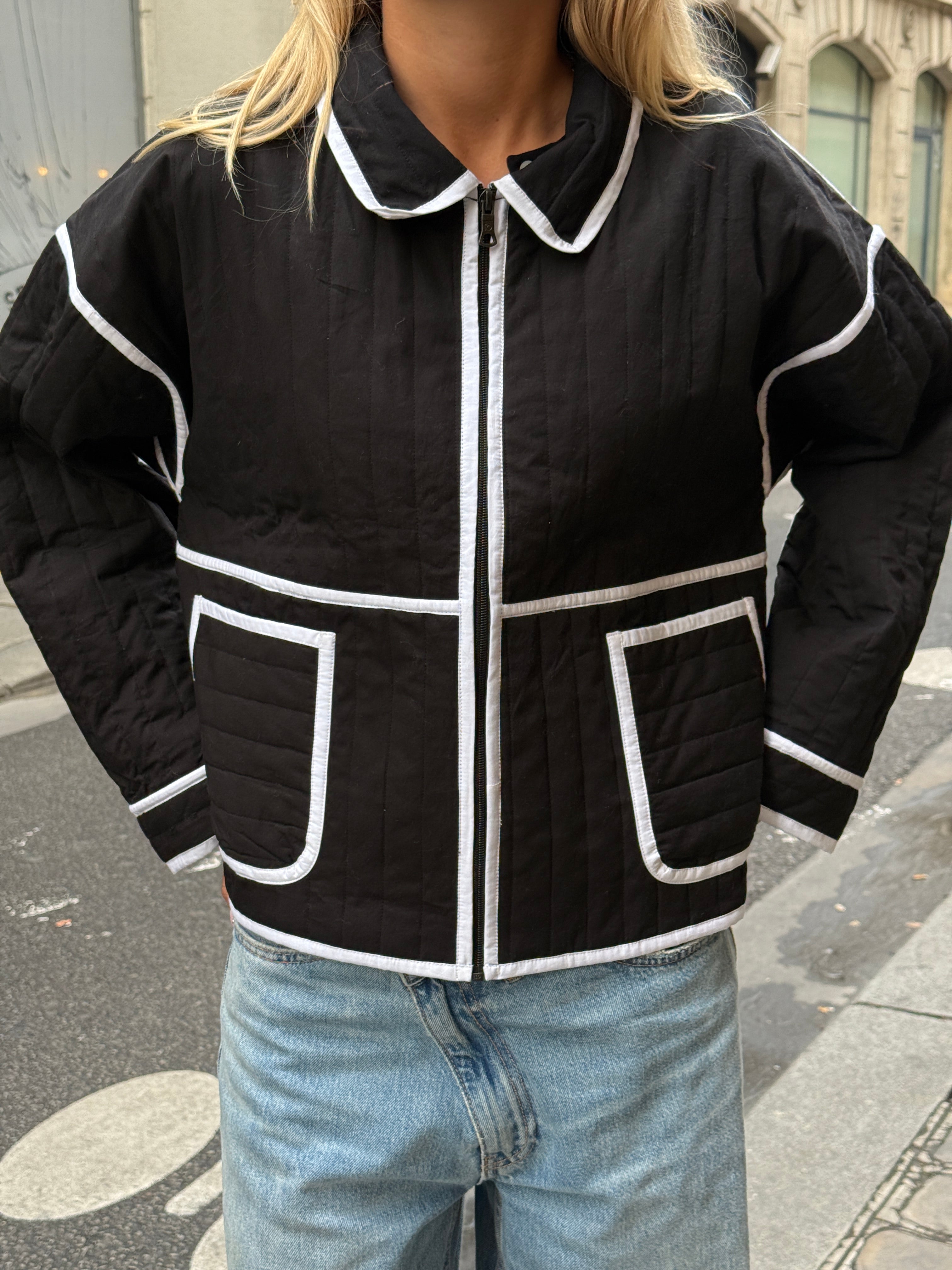 Our new Lou Jacket. Crafted from 100% cotton, this jacket combines comfort with durability. It is designed with a zipper closure and a structured collar. The quilted finish provides warmth and it has two front pockets. Subtle contrast-colored lines add a unique touch to the overall design.