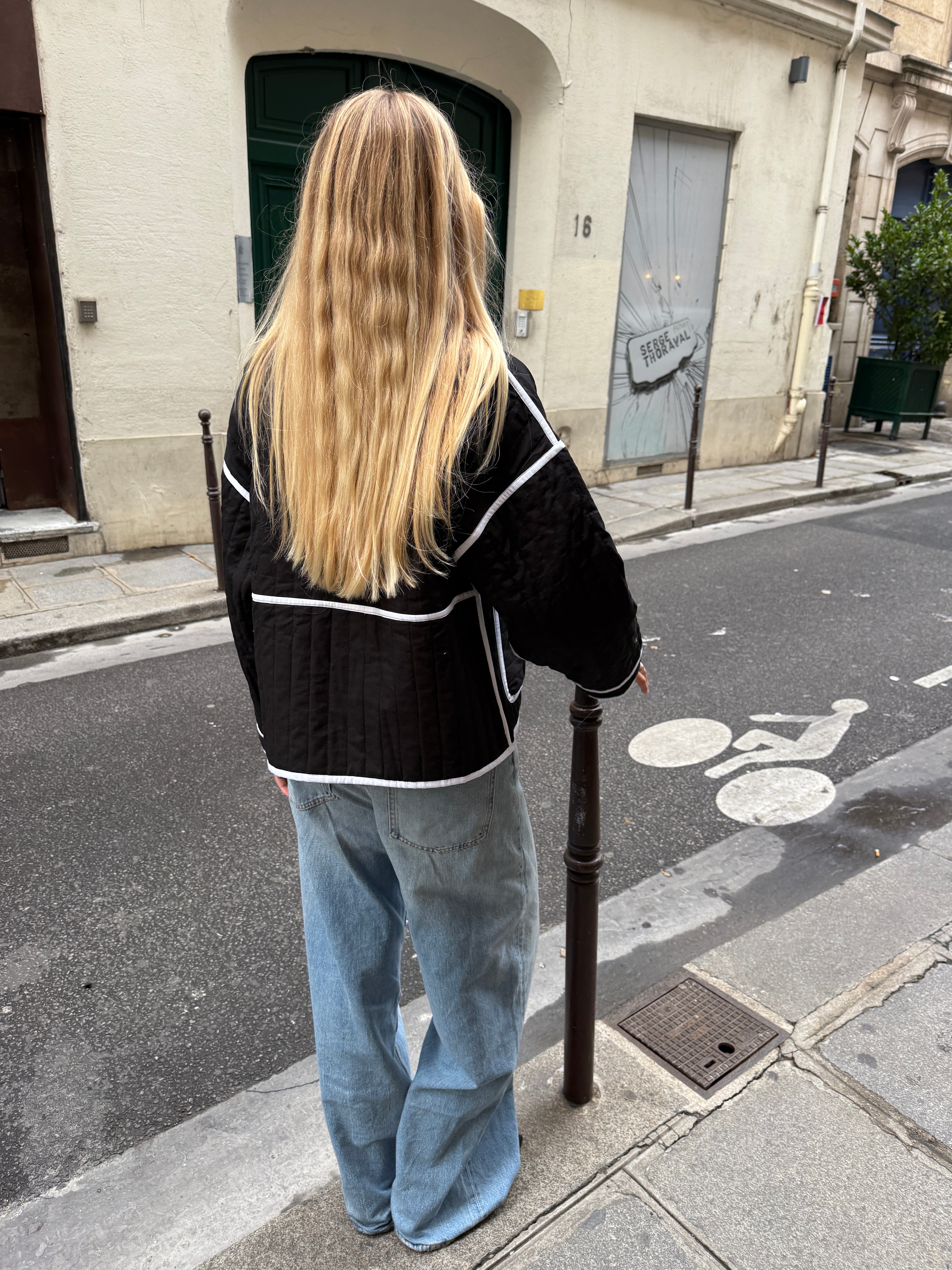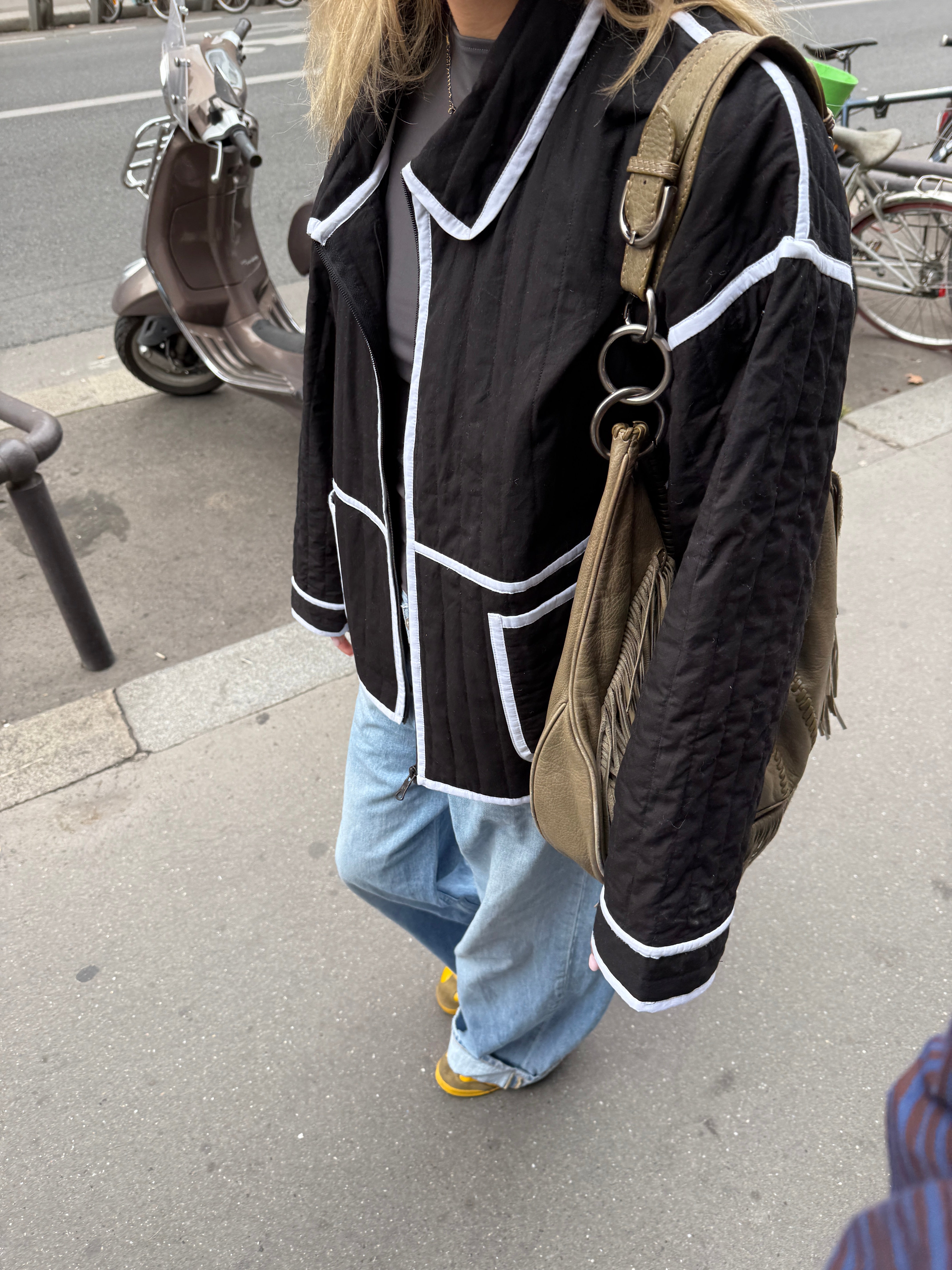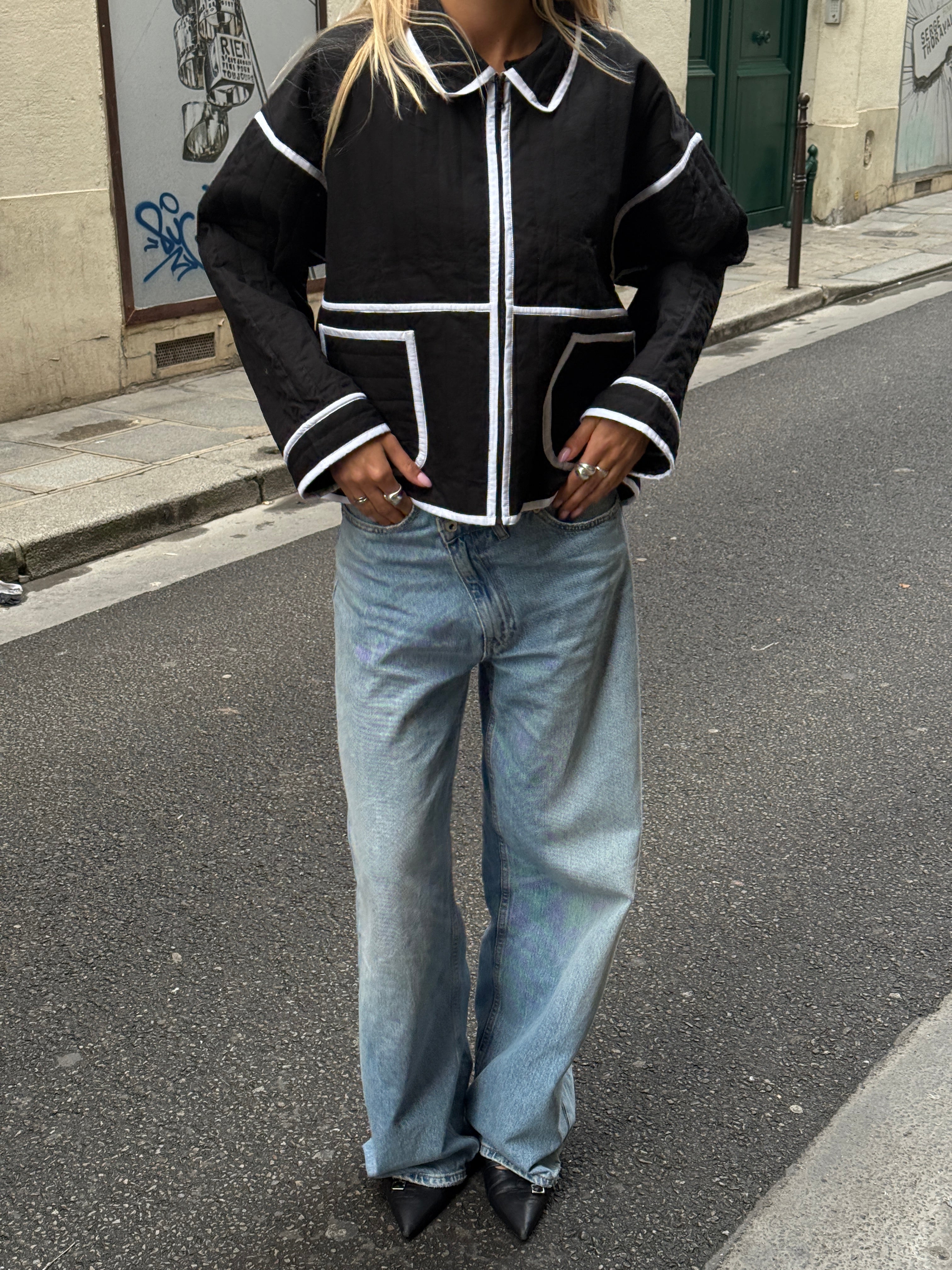 Our new Lou Jacket. Crafted from 100% cotton, this jacket combines comfort with durability. It is designed with a zipper closure and a structured collar. The quilted finish provides warmth and it has two front pockets. Subtle contrast-colored lines add a unique touch to the overall design.