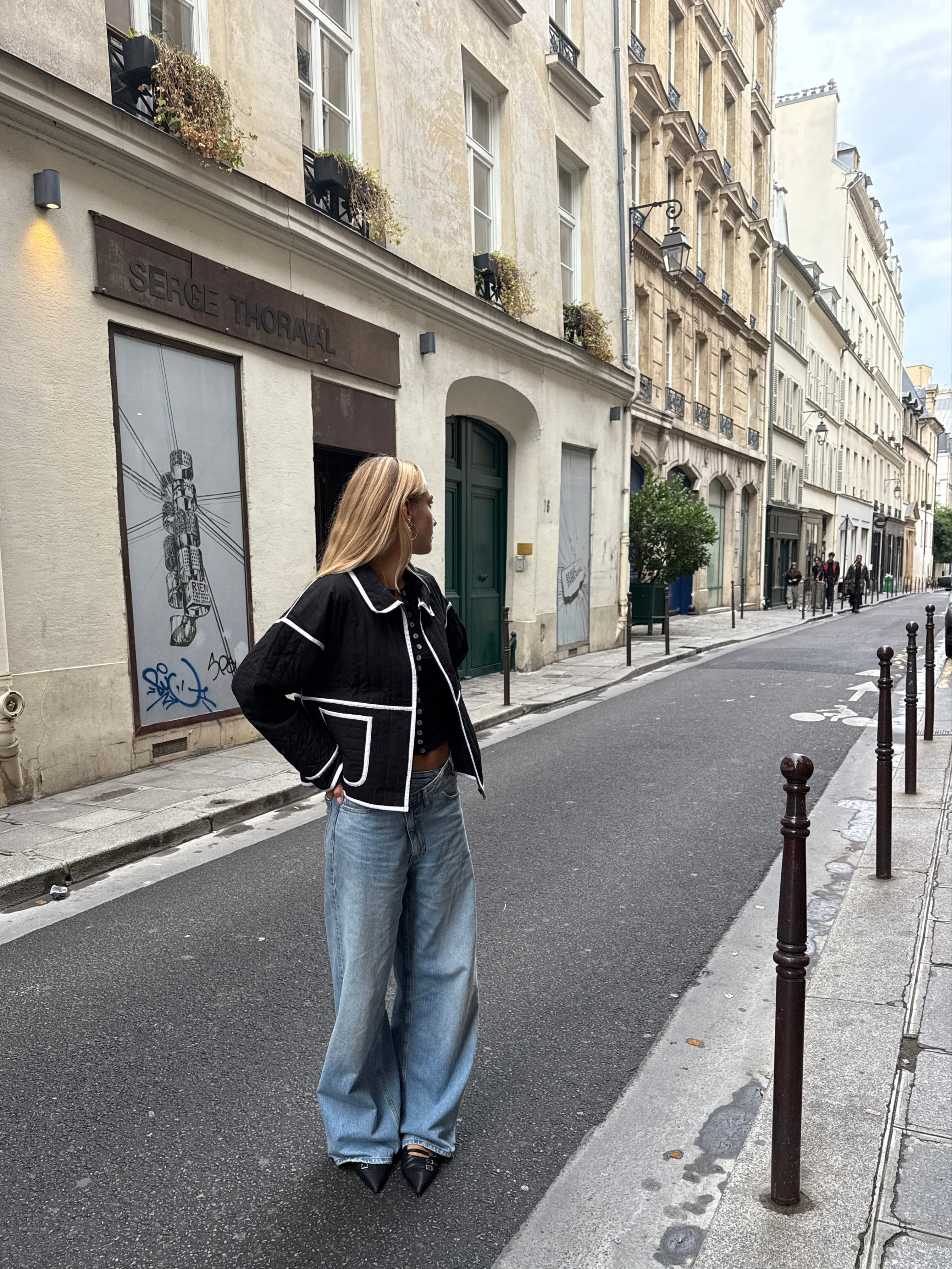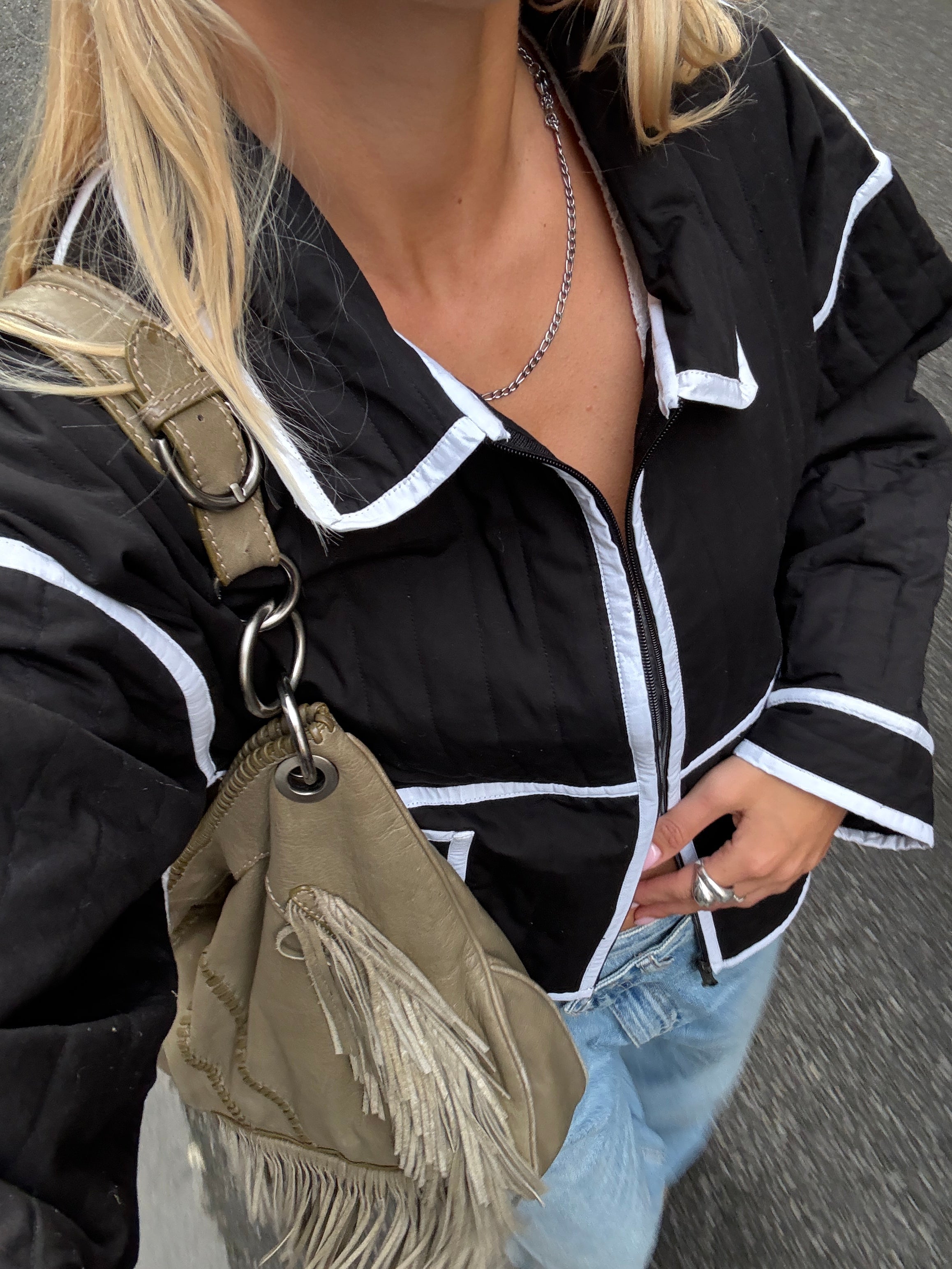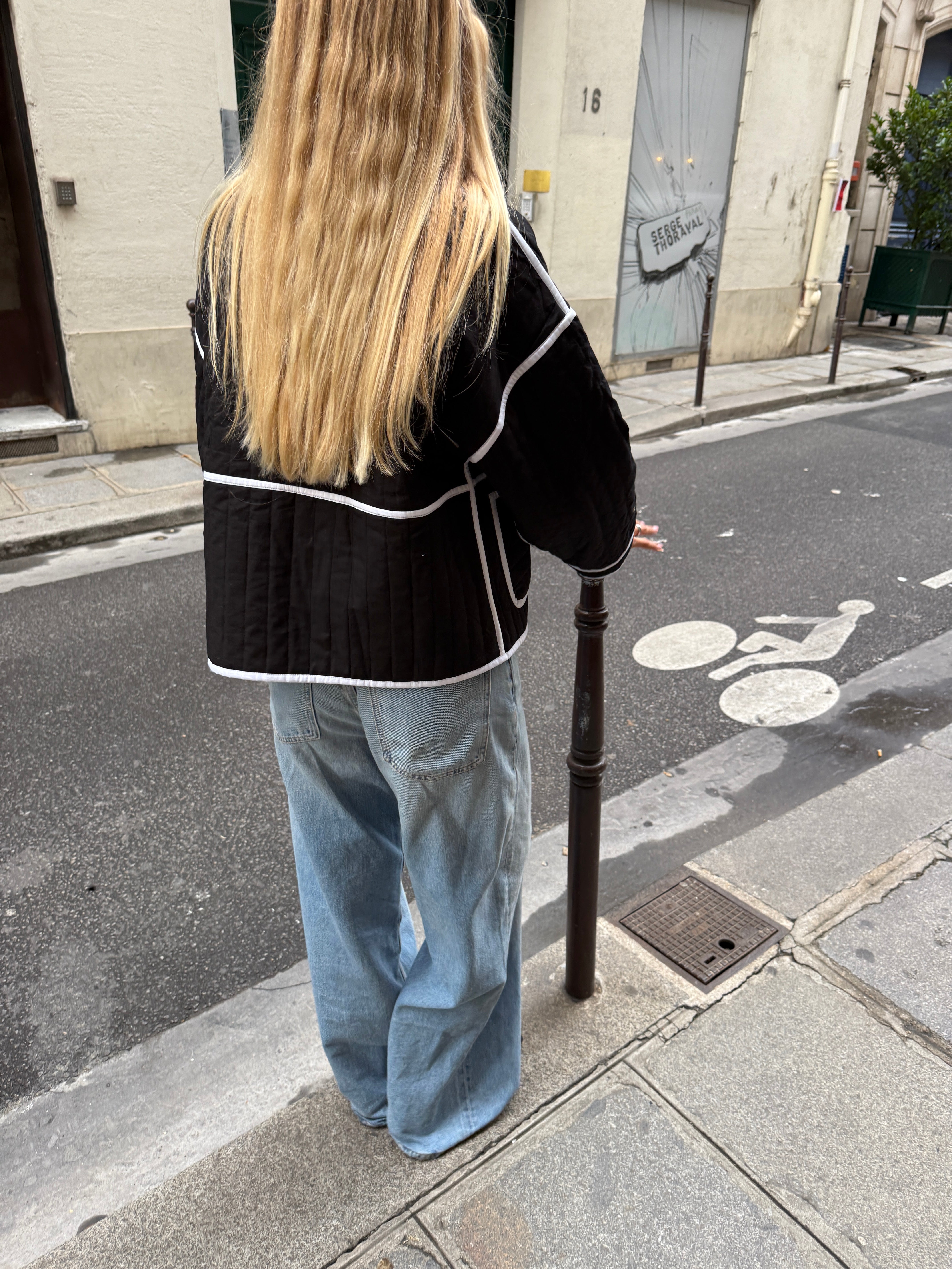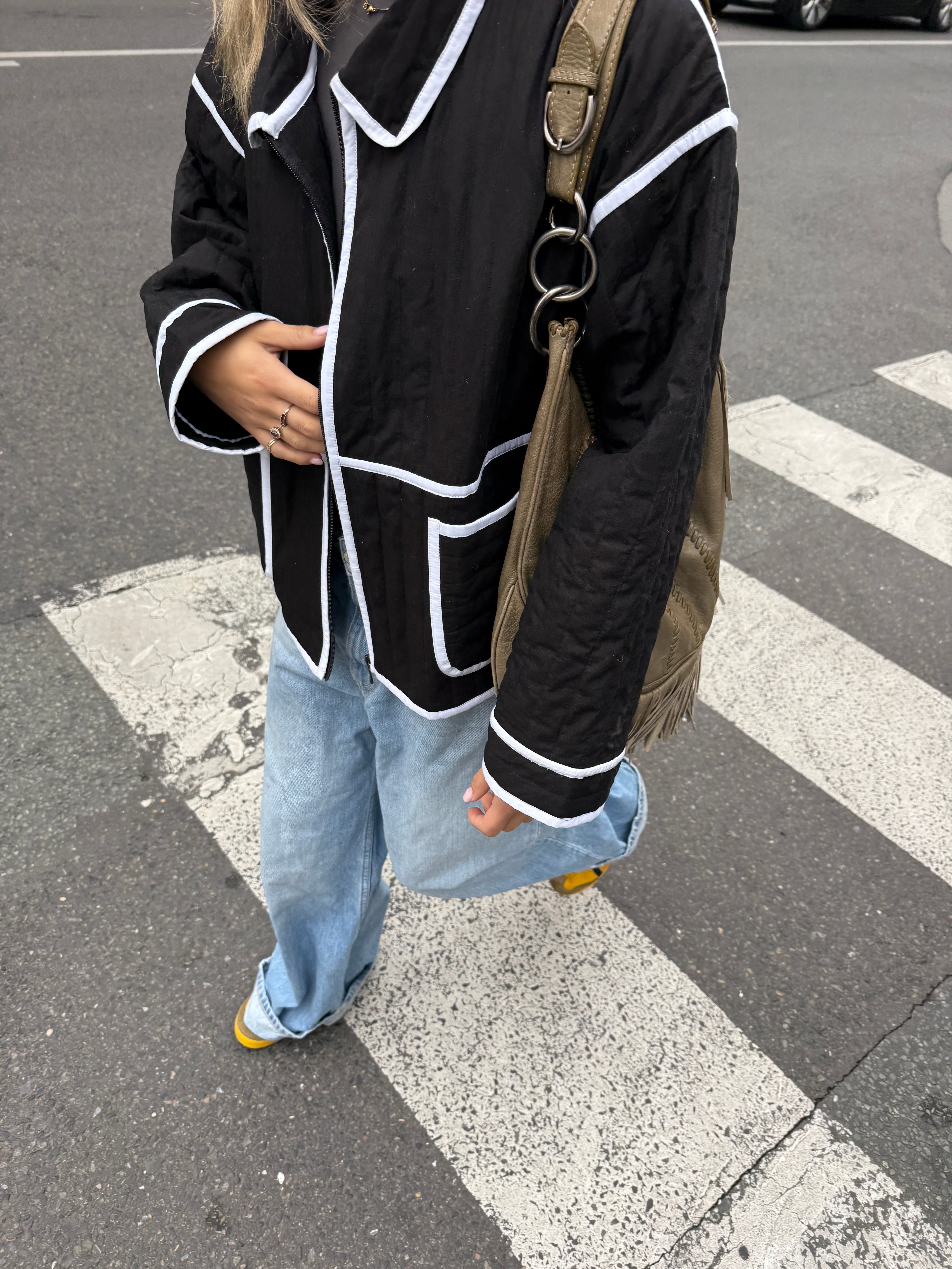 Our new Lou Jacket. Crafted from 100% cotton, this jacket combines comfort with durability. It is designed with a zipper closure and a structured collar. The quilted finish provides warmth and it has two front pockets. Subtle contrast-colored lines add a unique touch to the overall design.