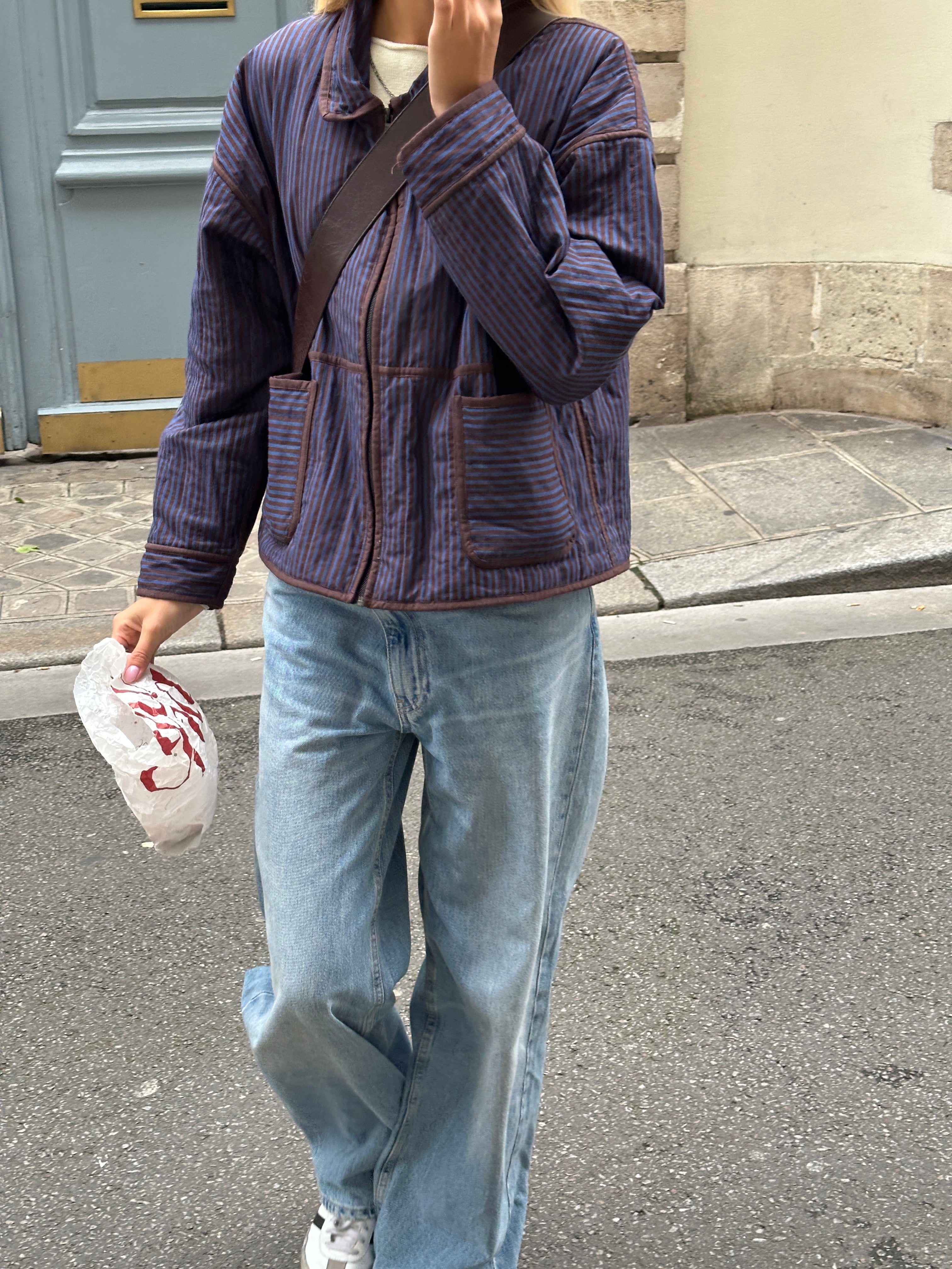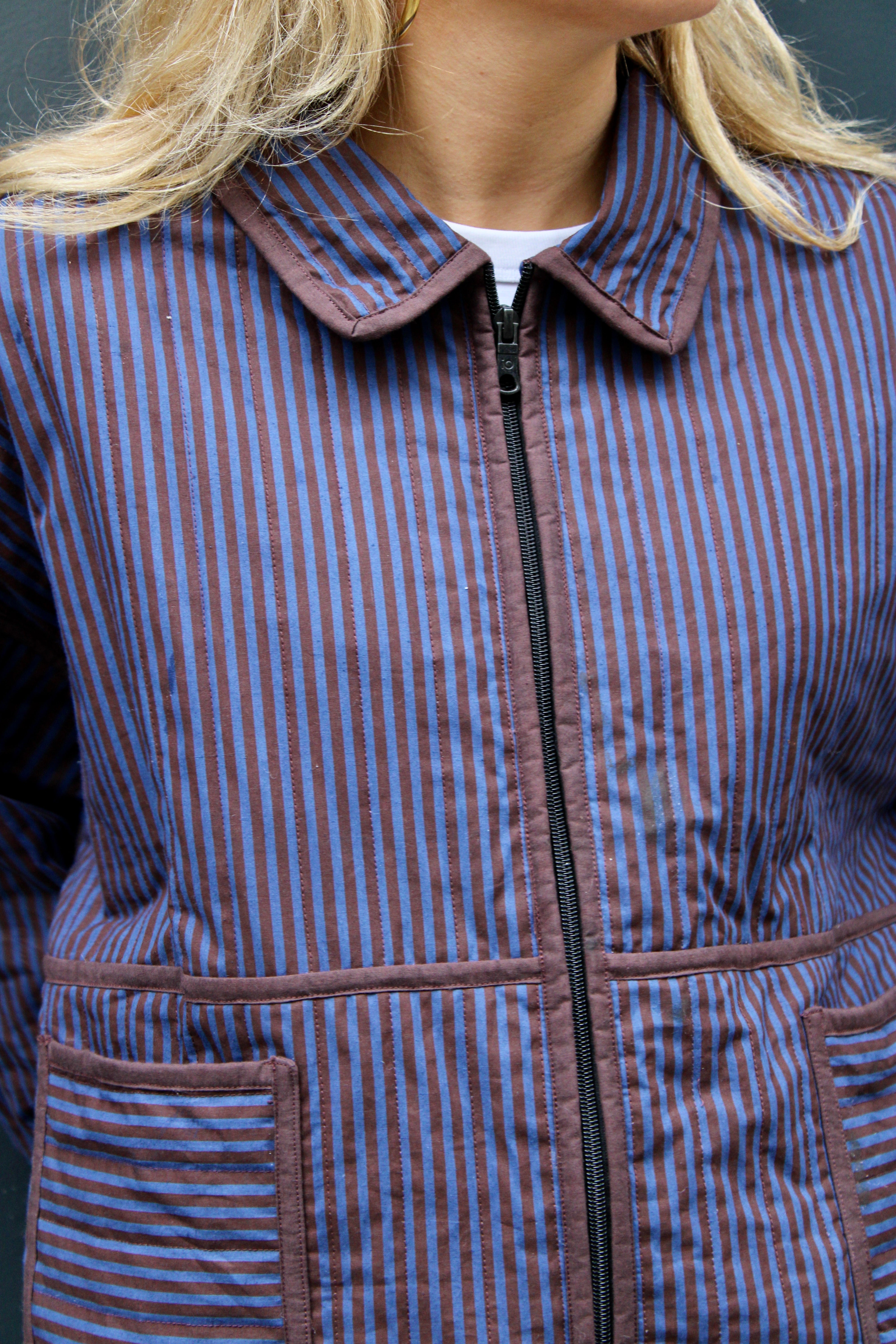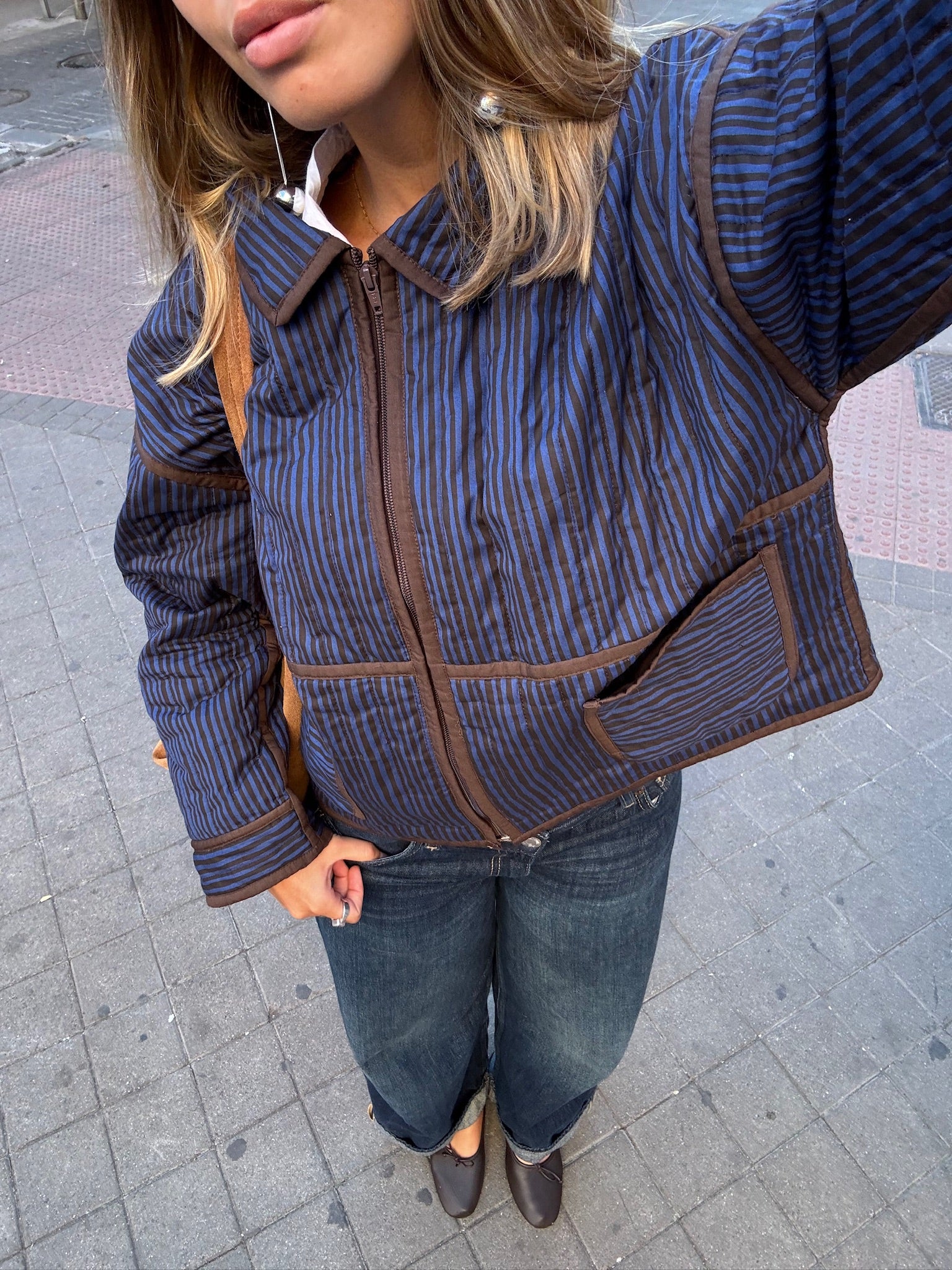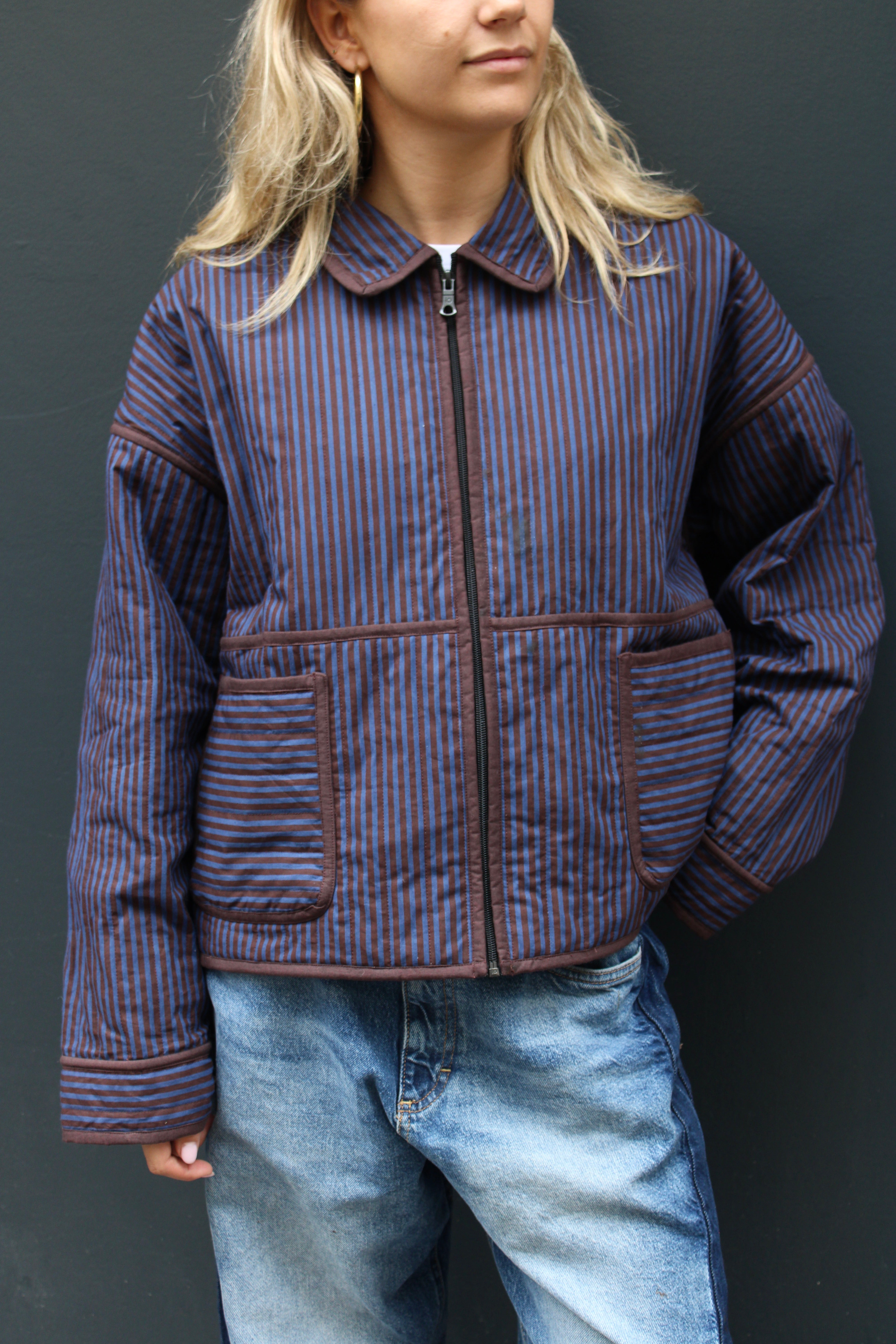 Our new Lou Jacket. Crafted from 100% cotton, this jacket combines comfort with durability. It is designed with a zipper closure and a structured collar. The quilted finish provides warmth and it has two front pockets. Subtle contrast-colored lines add a unique touch to the overall design.