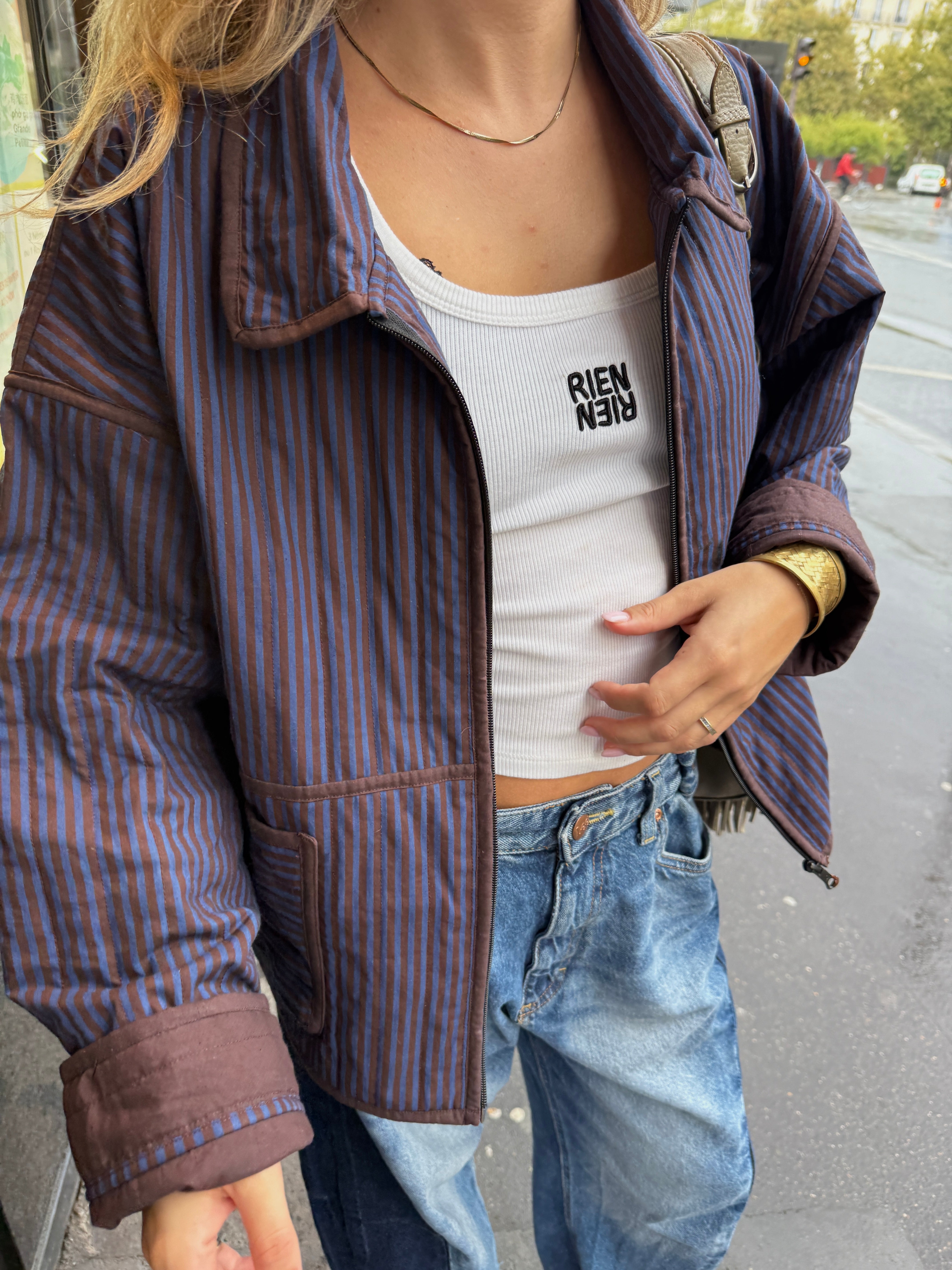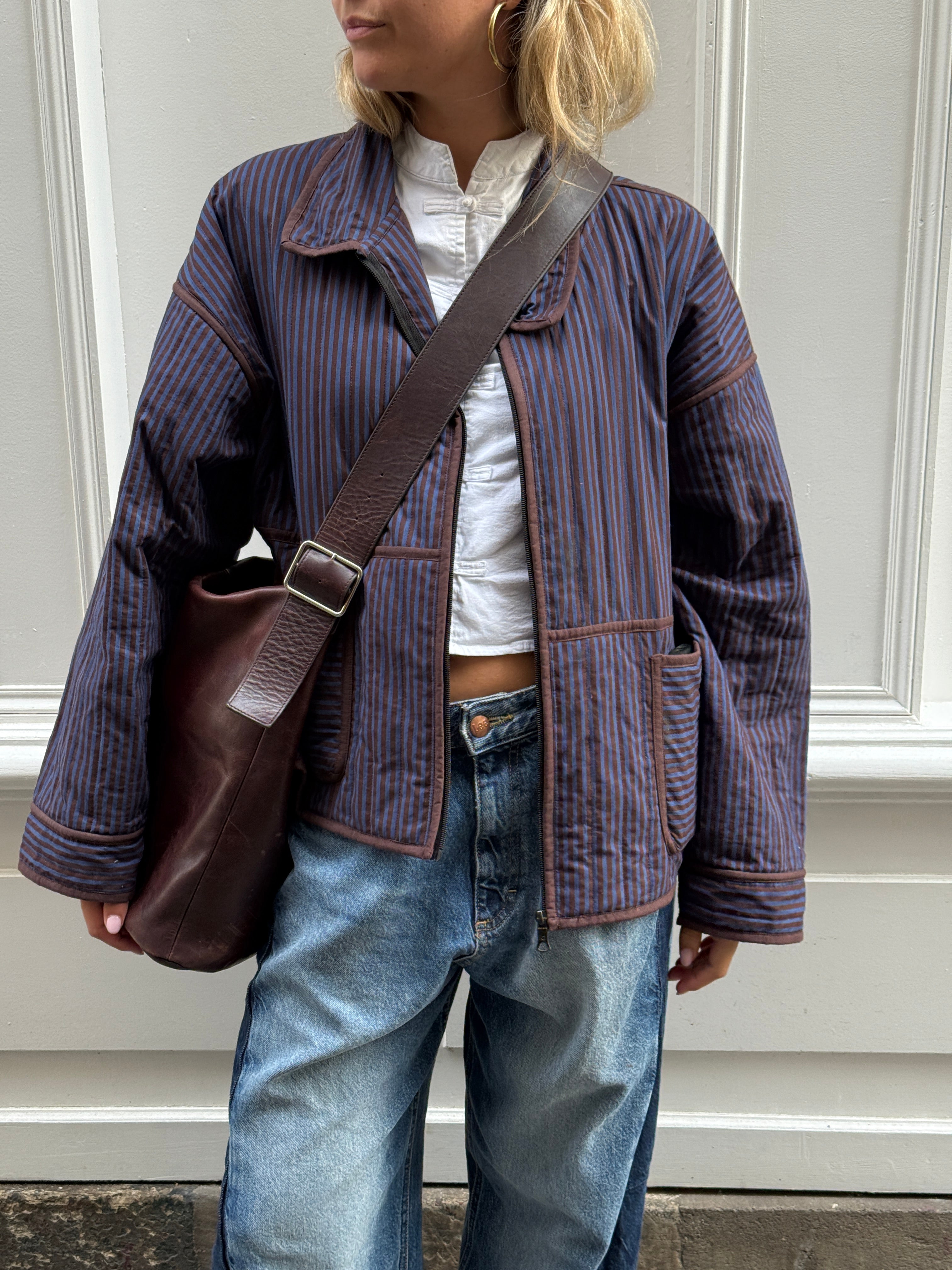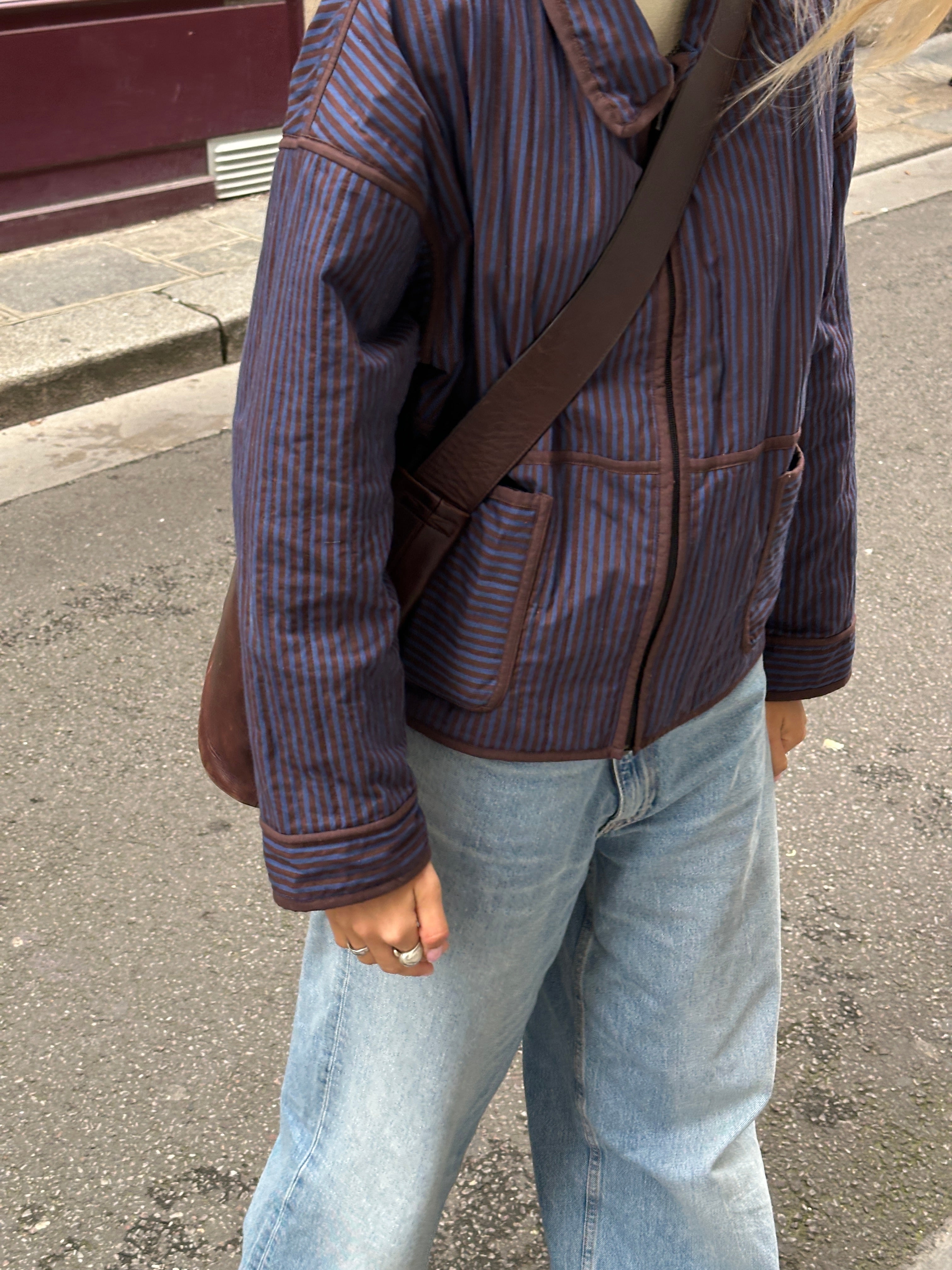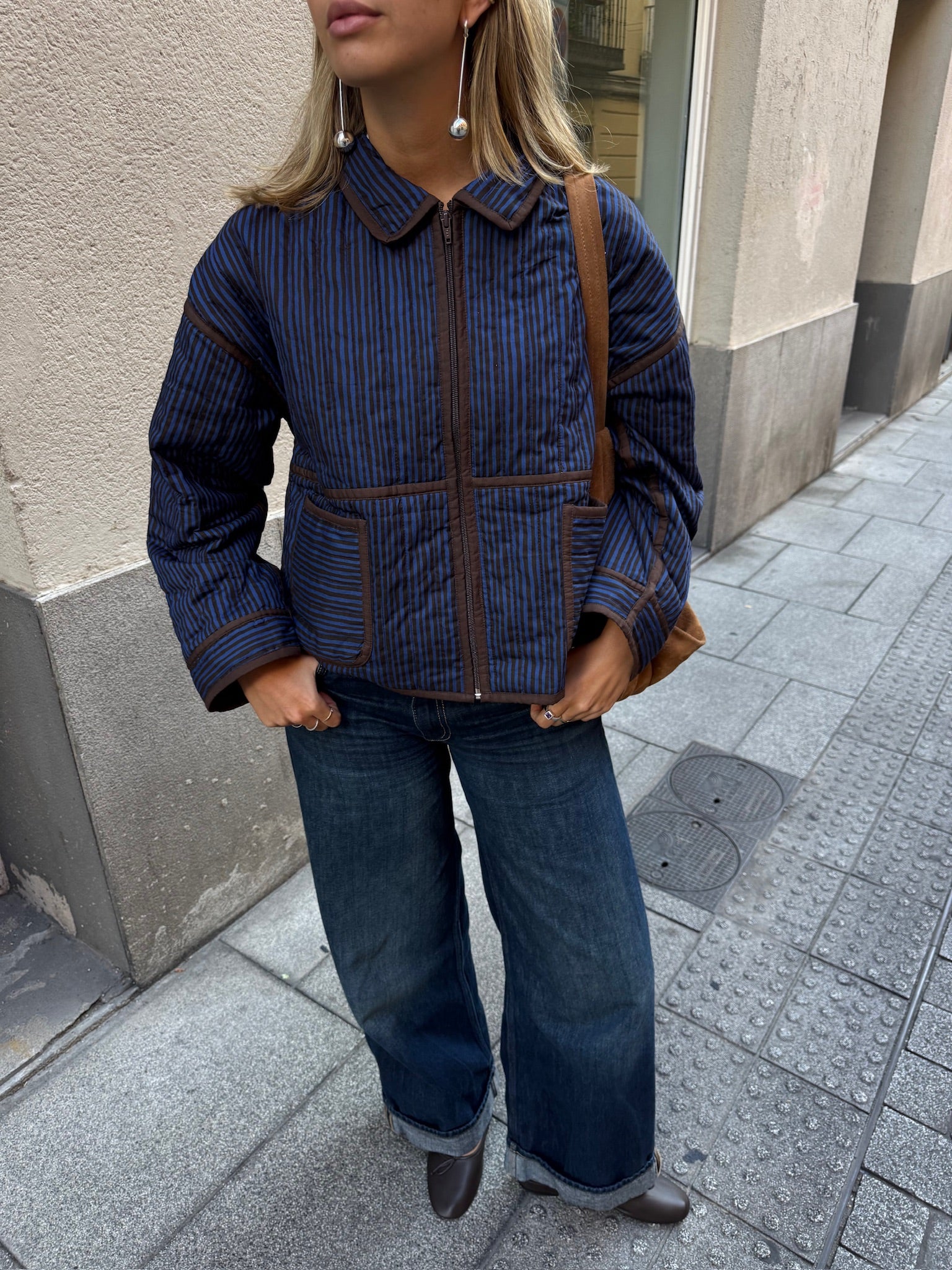Our new Lou Jacket. Crafted from 100% cotton, this jacket combines comfort with durability. It is designed with a zipper closure and a structured collar. The quilted finish provides warmth and it has two front pockets. Subtle contrast-colored lines add a unique touch to the overall design.