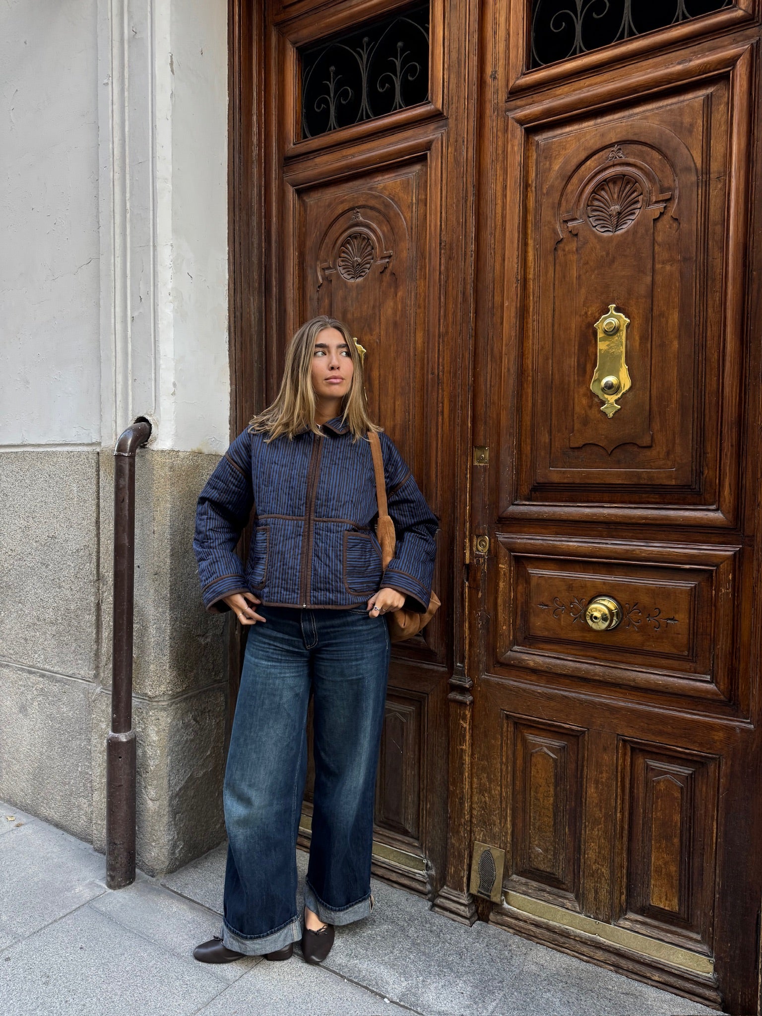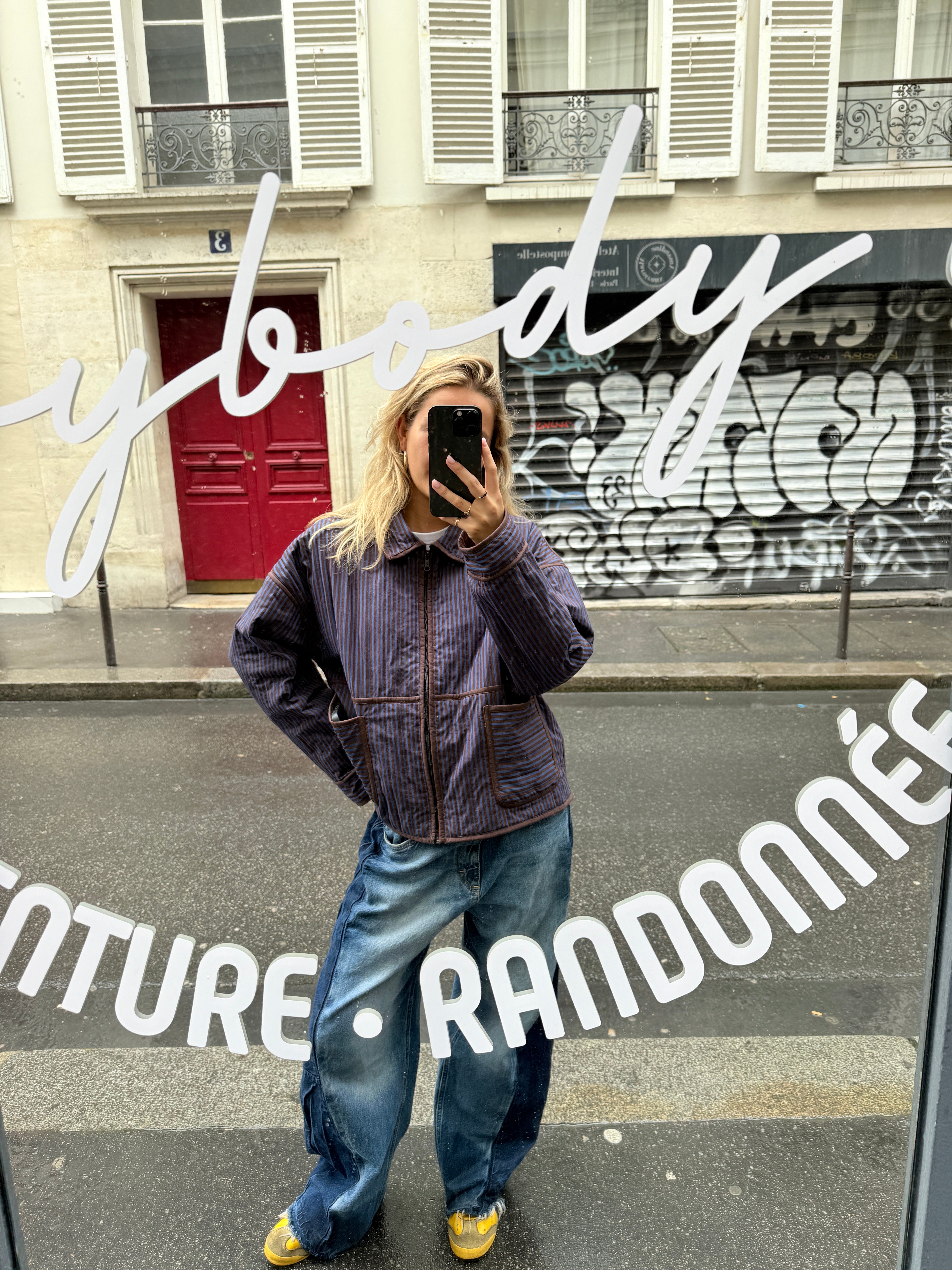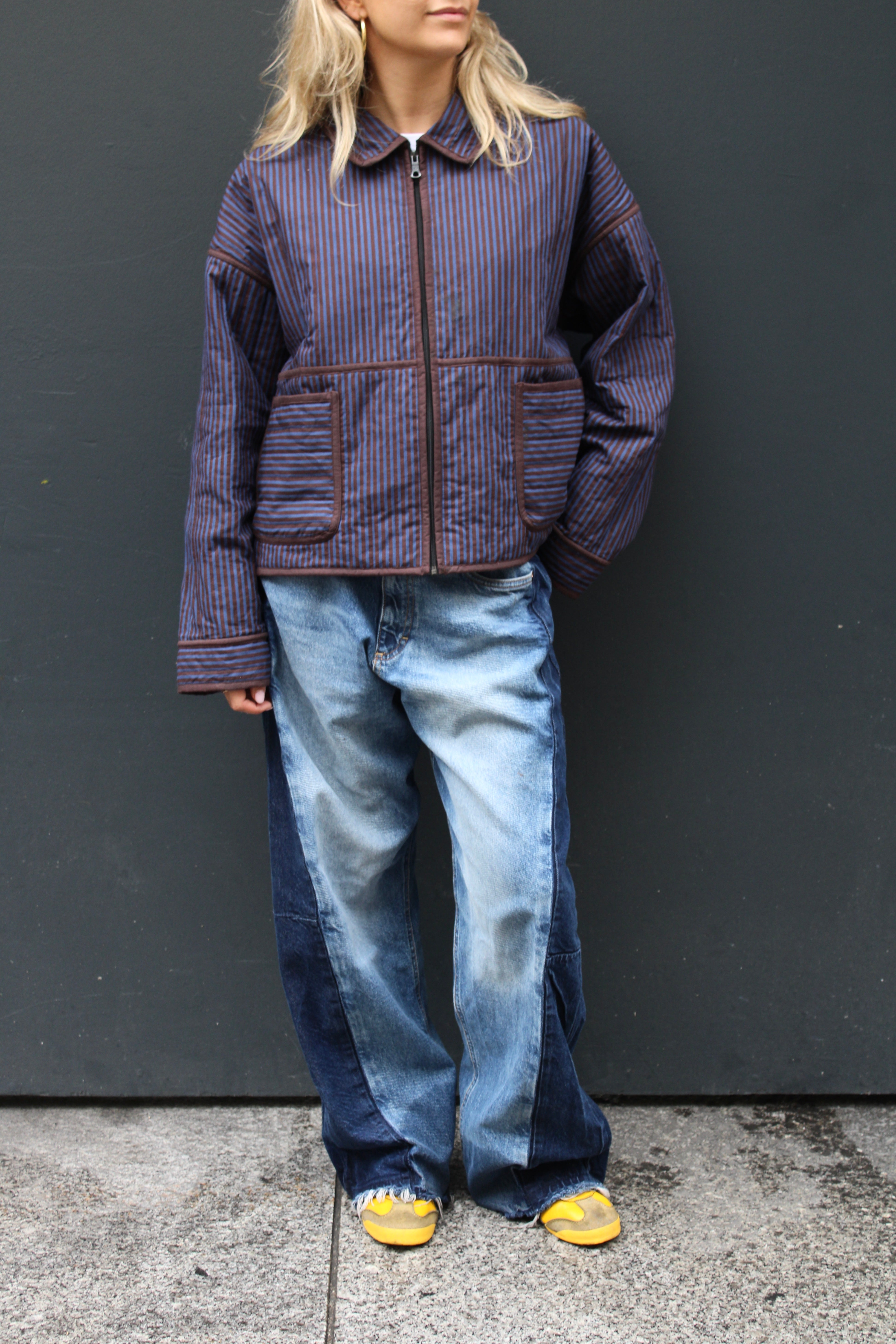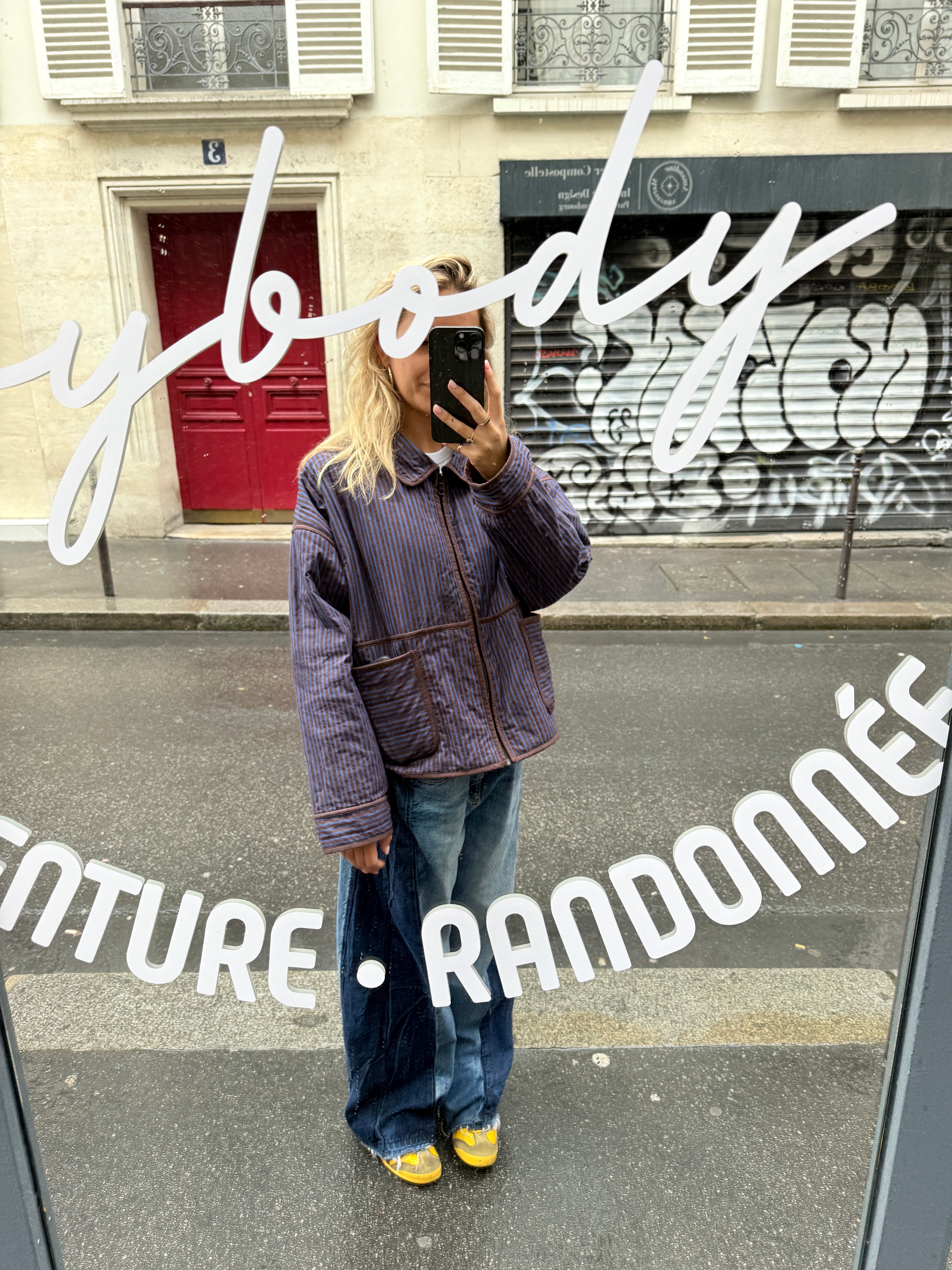 Our new Lou Jacket. Crafted from 100% cotton, this jacket combines comfort with durability. It is designed with a zipper closure and a structured collar. The quilted finish provides warmth and it has two front pockets. Subtle contrast-colored lines add a unique touch to the overall design.