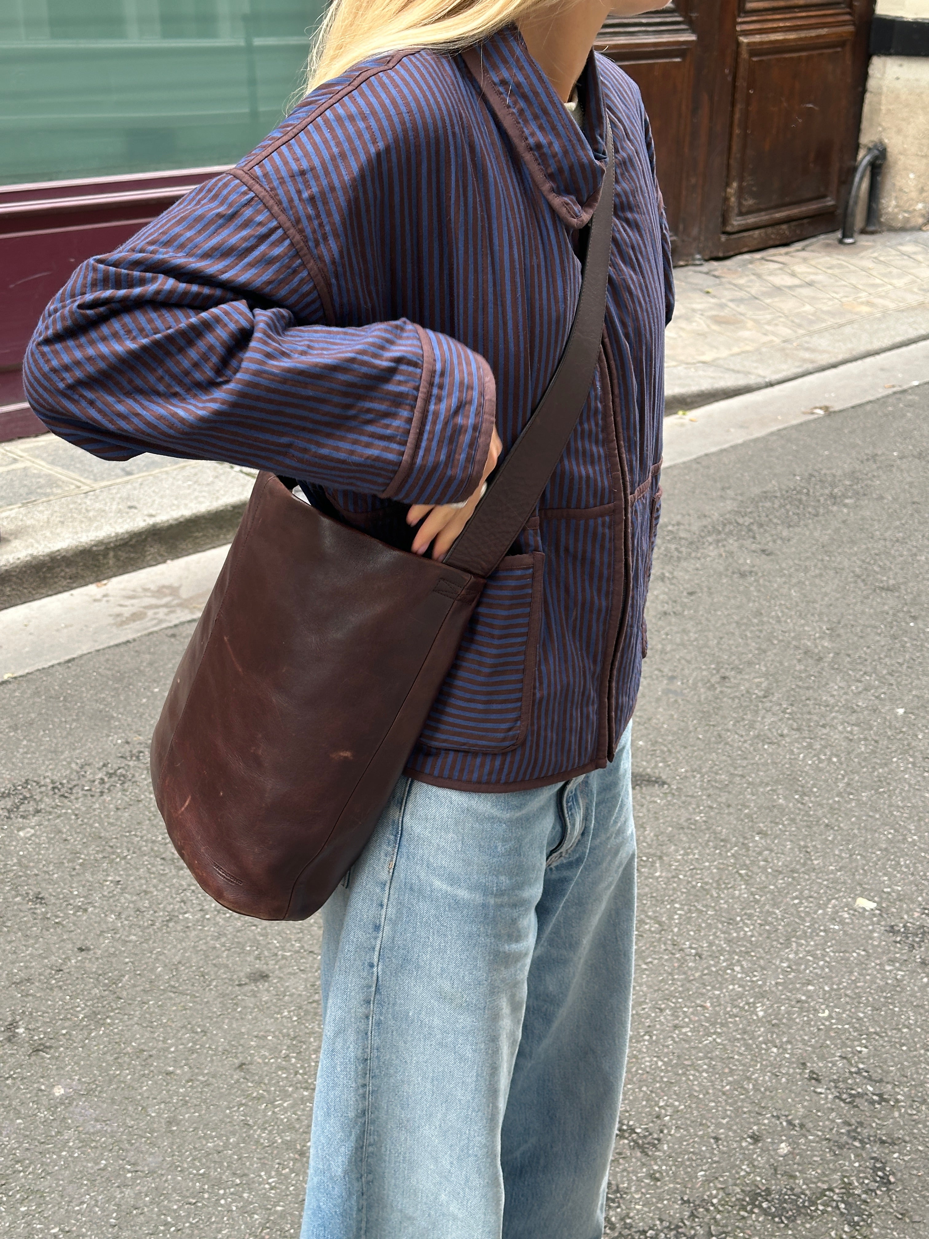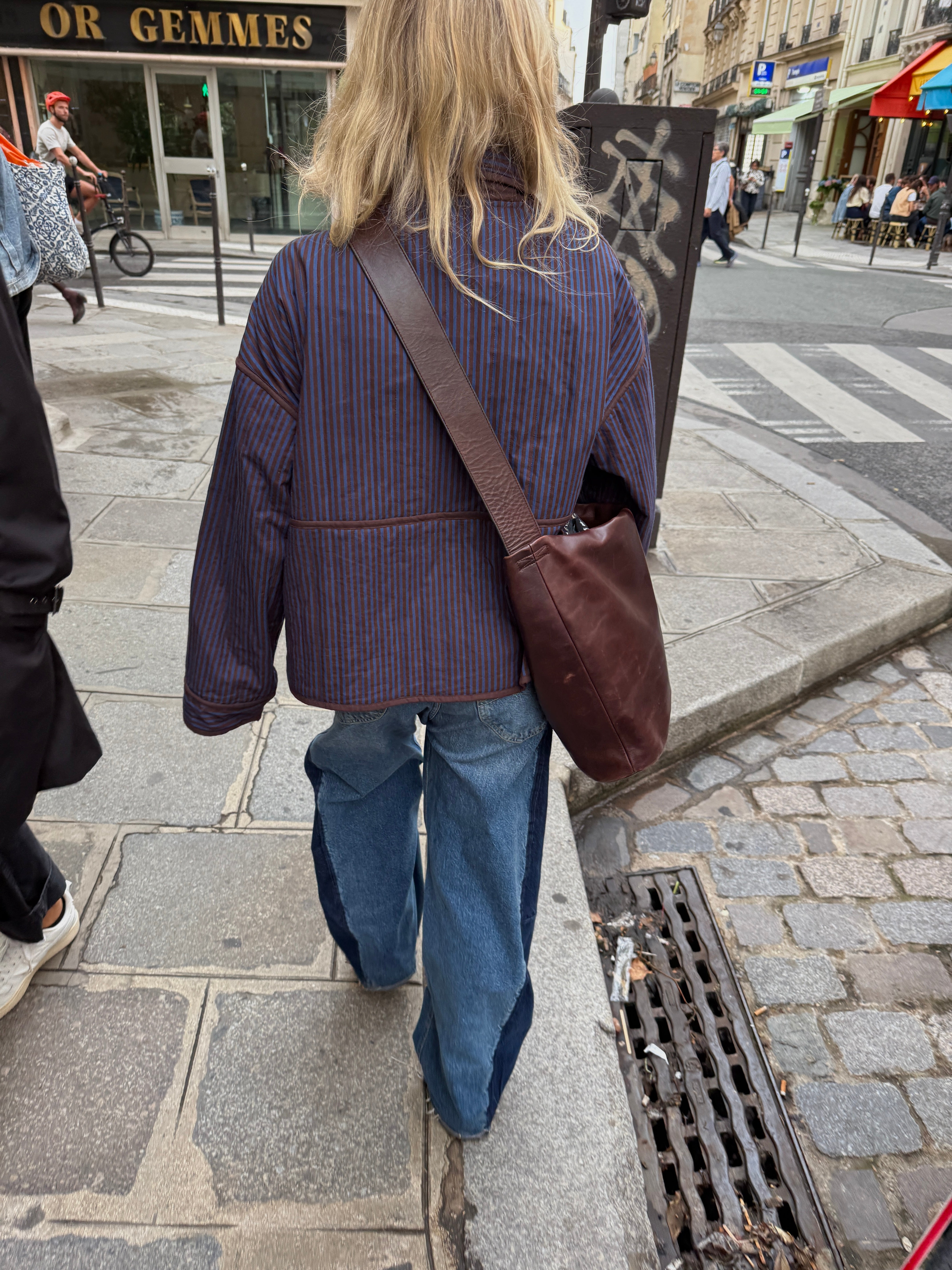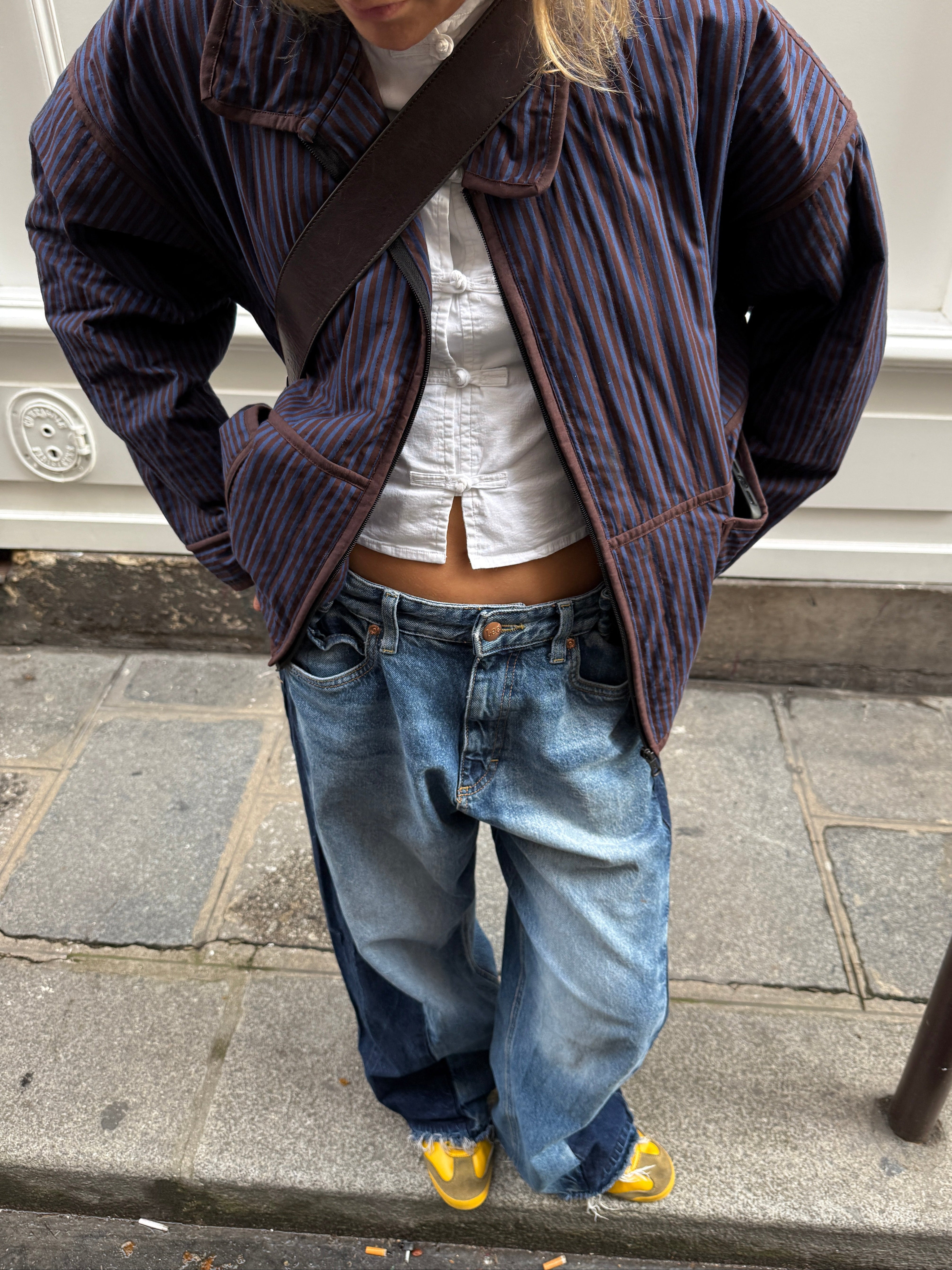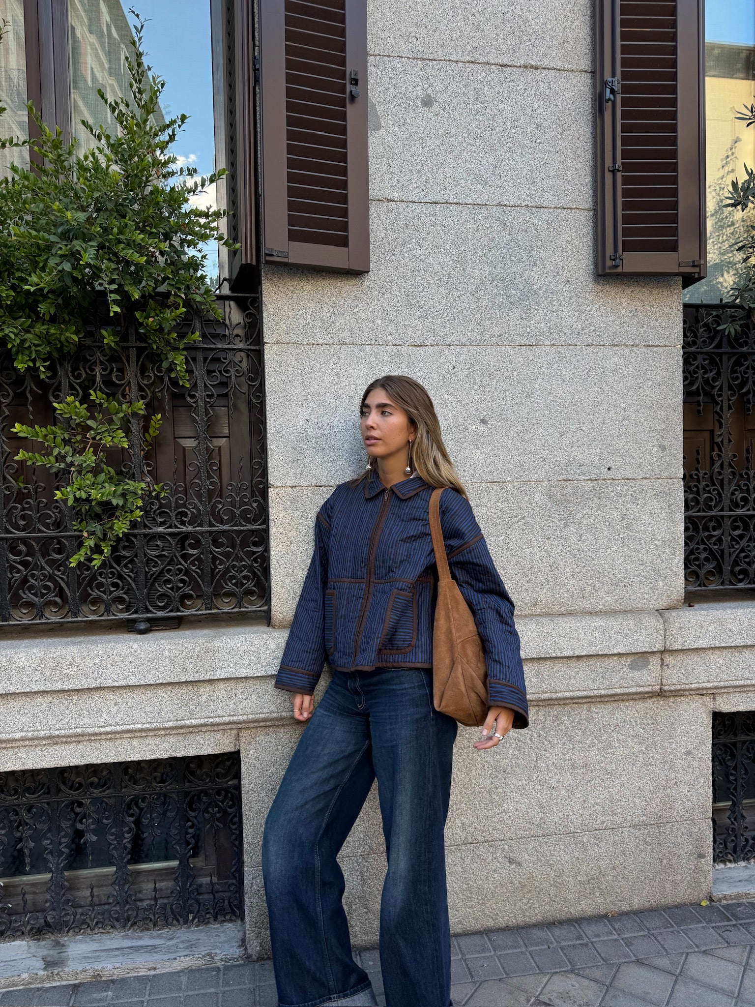 Our new Lou Jacket. Crafted from 100% cotton, this jacket combines comfort with durability. It is designed with a zipper closure and a structured collar. The quilted finish provides warmth and it has two front pockets. Subtle contrast-colored lines add a unique touch to the overall design.