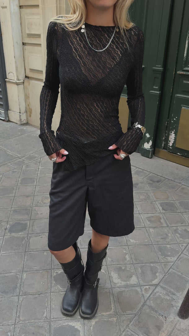 Introducing our new Lucy Top. This long-sleeve top is made of soft, stretchable lace fabric. It has an asymmetrical fit and is wrinkled up on one side, giving it a playful look. The top is designed to fit perfectly around your body. Ethically made in India.