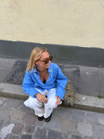 Introducing our new Pall Blouse. This fun striped blouse features an oversized fit with two side strings to tie at the waist for a tailored look. Made from soft poplin material, and detailed with contrast color embroidery on the collar and cuffs. Ethically made in India.