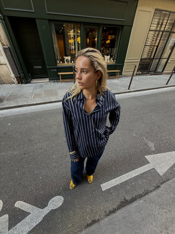 Introducing our new Pall Blouse. This fun striped blouse features an oversized fit with two side strings to tie at the waist for a tailored look. Made from soft poplin material, and detailed with contrast color embroidery on the collar and cuffs. Ethically made in India.