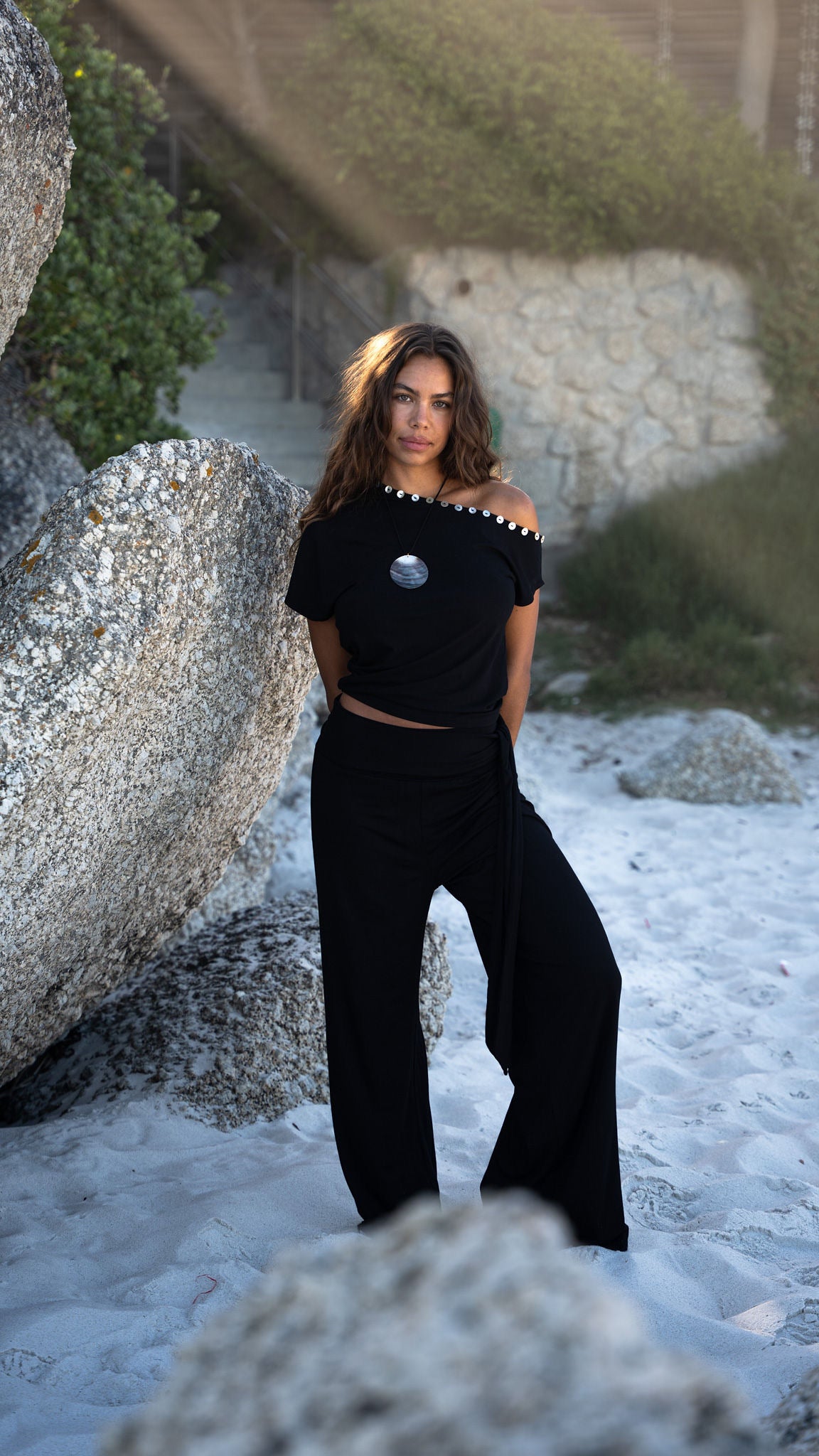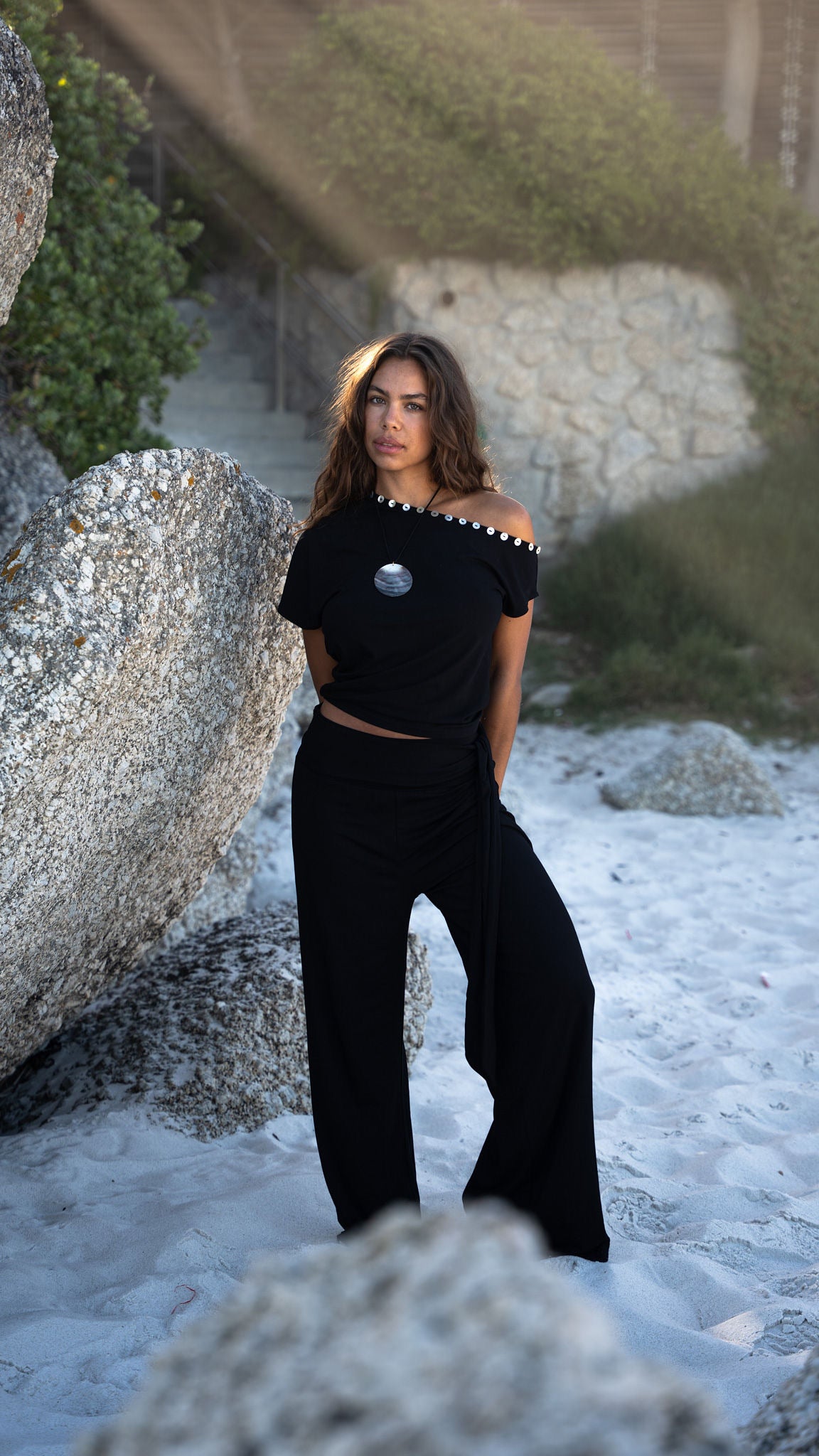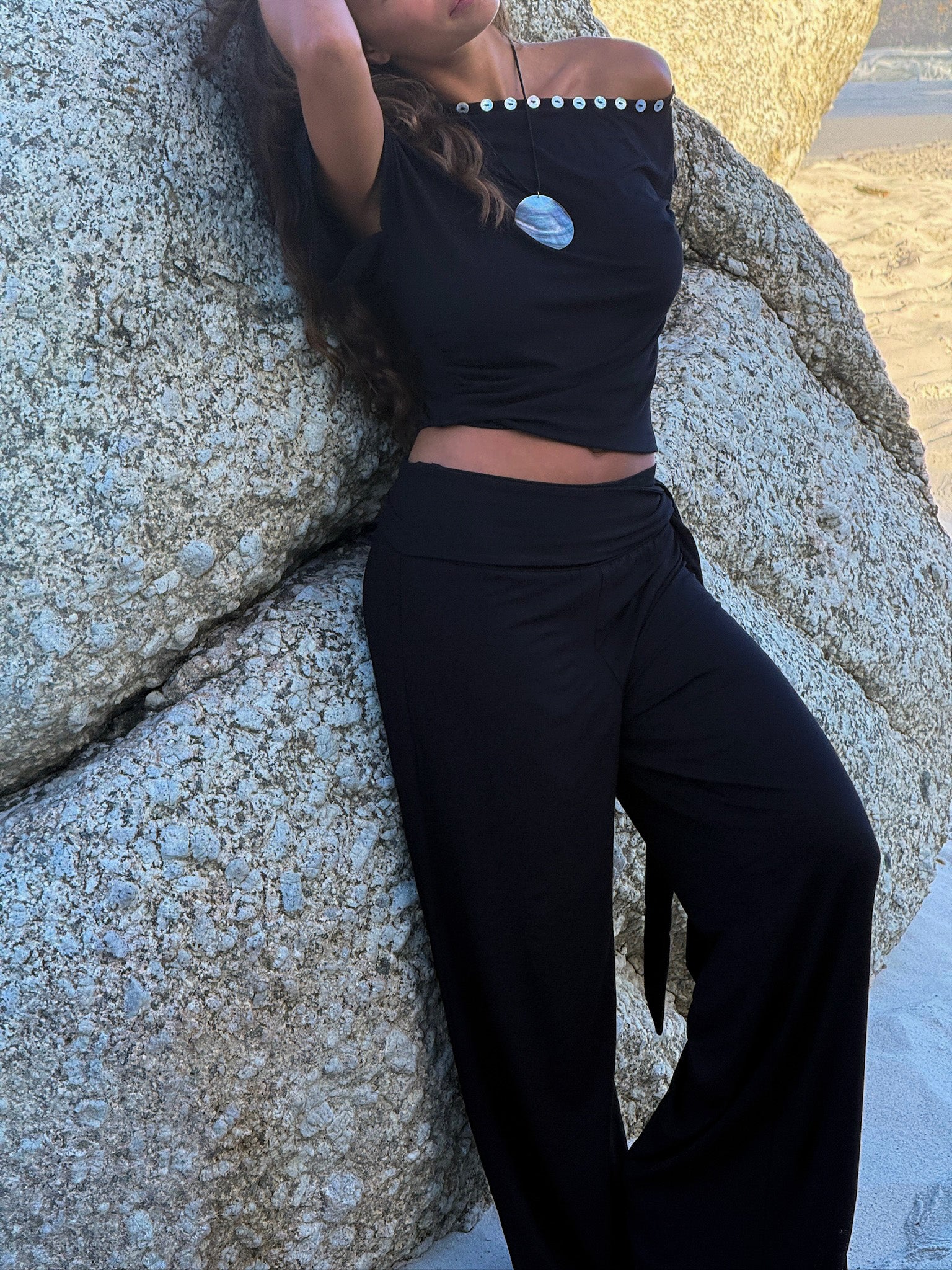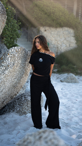 Introducing our new Sumba Pants. This super stretchy and long pants pants has two strings on the waistband to tie as you like. The fabric is super soft and comfortable. The perfect pants for a sunny day in the city or on vacation. The cutest set with our July Top.